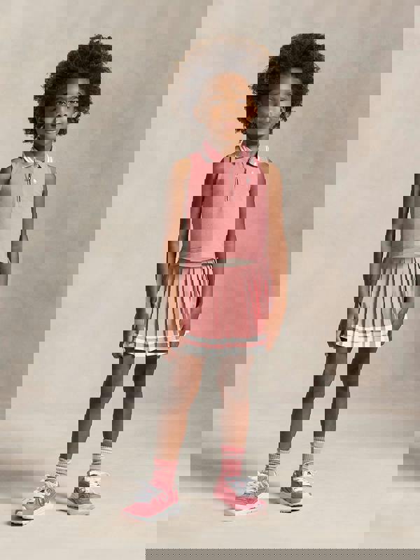 This pleated skort combines a crisp, structured look with practical comfort. Striped trim and pieced stripes at the hem add definition, while stretch jersey shorts sit inside for ease of movement. A signature Pony print at the left hip finishes the design with a recognisable Ralph Lauren detail.