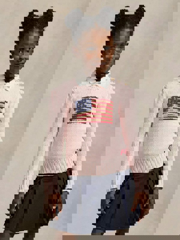 Ralph Lauren Kids brings a signature American look to this girls’ jumper in acacia pink. Made from 100% cotton, it comes in a soft cotton knit with a rib-knit crew neck and rib-knit cuffs for a clean, classic finish. An intarsia-knit USA flag sits at the front, detailed with embroidered stars for added texture.