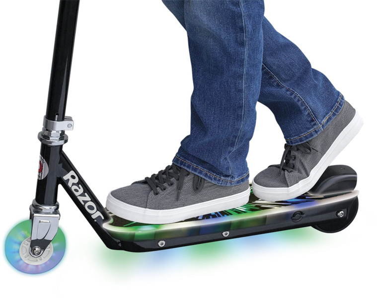 Control is made simple and intuitive on the Razor Electric Tekno Scooter. Acceleration is handled via an easy-to-use push button throttle located on the handlebar, while the integrated foot-controlled rear fender brake ensures reliable stopping power. The scooter is constructed with a durable steel frame and fork for lasting use, featuring an anti-slip deck surface enhanced by the captivating embedded blue LED lights. Urethane wheels provide a smooth glide over paved surfaces, and a retractable kickstand adds convenience for parking between rides.