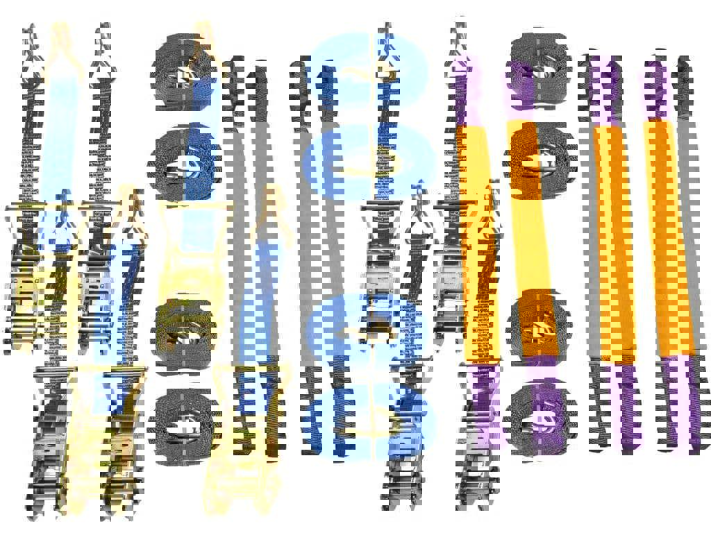 Kit : 4 - Ratchet Handles, 4 - Long Ends With Claw Hooks, 4 - Round Slings