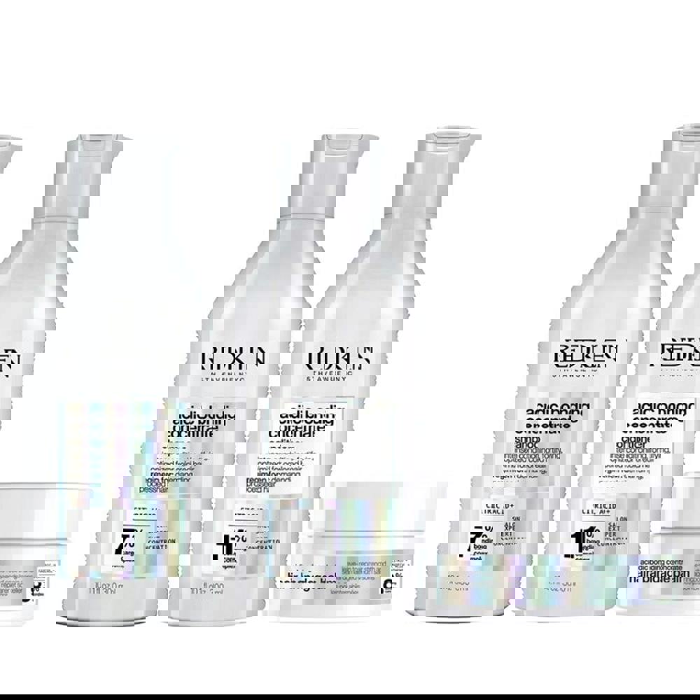 Transform and treat your damaged hair with the Redken Acidic Bonding Concentrate Hair Bandage Balm Bundle, featuring Acidic bonding concentrate shampoo & Conditioner. Redken's Acidic Bonding Concentrate Hair Bandage Balm helps visibly seal damaged, dry split ends in one use*. Its 8% bonding care complex helps repair broken bonds, boosting strength and elasticity. Enjoy the balm's rich, warm scent with notes of salted lemon mandarin, blood orange jasmine, and cedarwood sugared amber. Combine with Acidic Bonding Concentrate Shampoo and Conditioner, the dynamic duo that works in synergy to fortify every strand, leaving lengths feeling and looking significantly stronger. Achieve intensely smoother, stronger, and visibly healthier hair with this complete regimen.