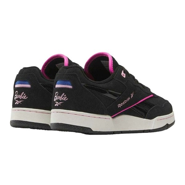 Reebok Childrens/Kids X Barbie BB 4000 II Suede Trainers in black with a low-cut, flat profile and a round toe. The upper combines leather, mesh and suede, finished with contrast detail, logo and patent elements. A synthetic lining sits alongside a rubber midsole and rubber outsole.