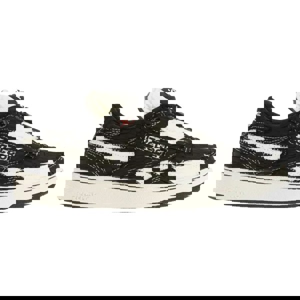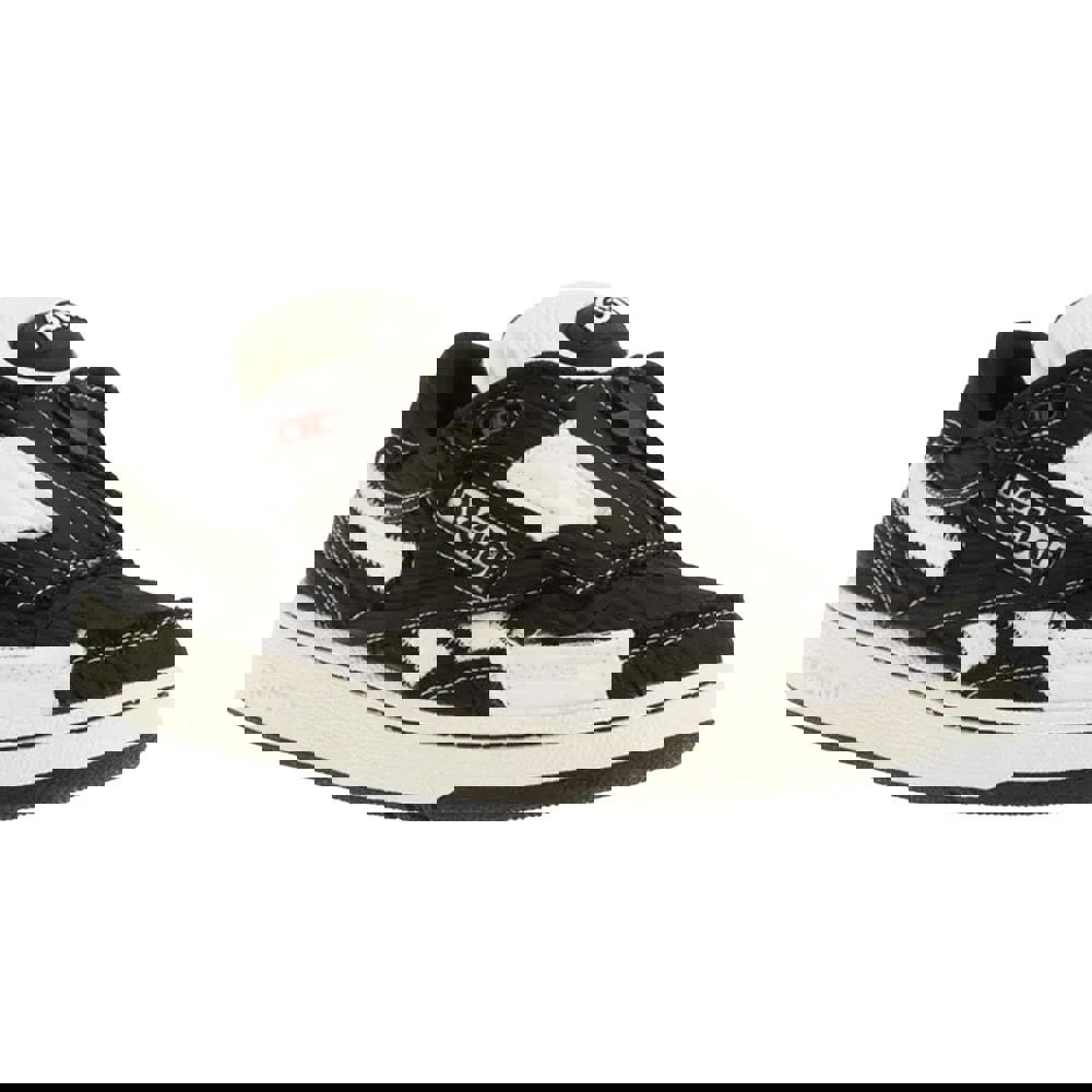 Reebok Club C 85 trainers in black and white with a low-cut profile and a chunky flat sole. The upper is made from synthetic material, paired with a textile lining for a clean internal finish. A round toe keeps the shape classic, while the contrast colour design adds definition to the overall look.