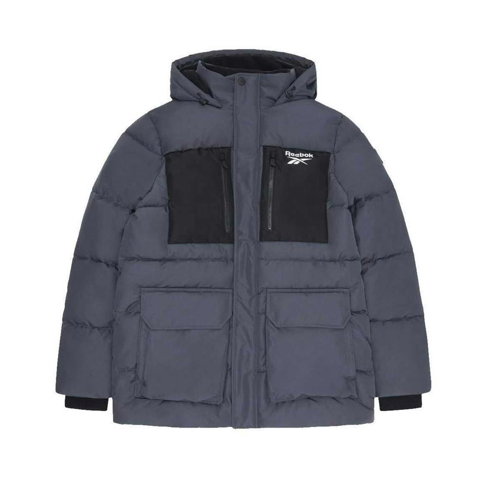 This Reebok puffer jacket is made from 100% polyester and comes in charcoal. It has an insulated, padded construction with a hooded neckline and a sew-on hood. Long sleeves are finished with ribbed cuffs, while the fitted hem keeps the shape neat.
