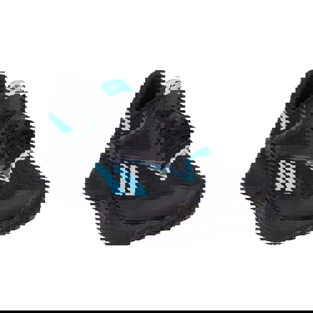 Reebok Speed 22 trainers in black and blue with a low-cut profile and flat sole. The upper combines synthetic and textile materials, paired with a textile lining for a clean, lightweight feel. A lace-up fastening runs through 9 eyelets, finished with contrast detailing, a patterned design and logo branding.