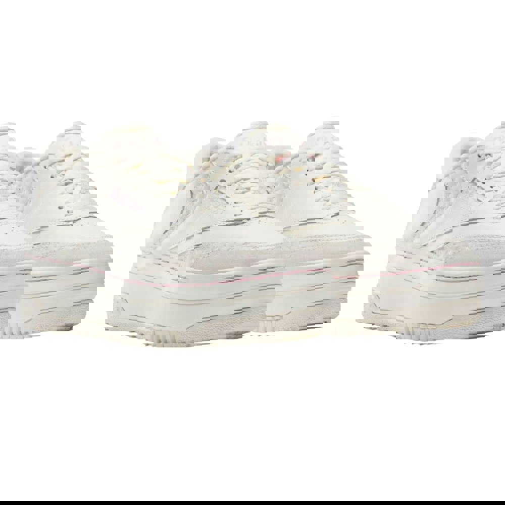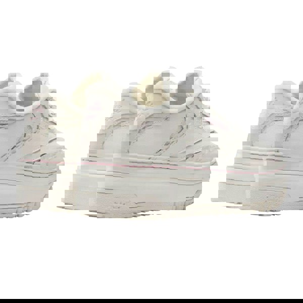 Reebok X Barbie Club C trainers in white and pink with a lace-up fastening and a round toe. The upper combines leather and mesh, finished with a suede panel and logo detailing. A synthetic lining and rubber outsole complete the construction, with a flat profile for everyday wear.