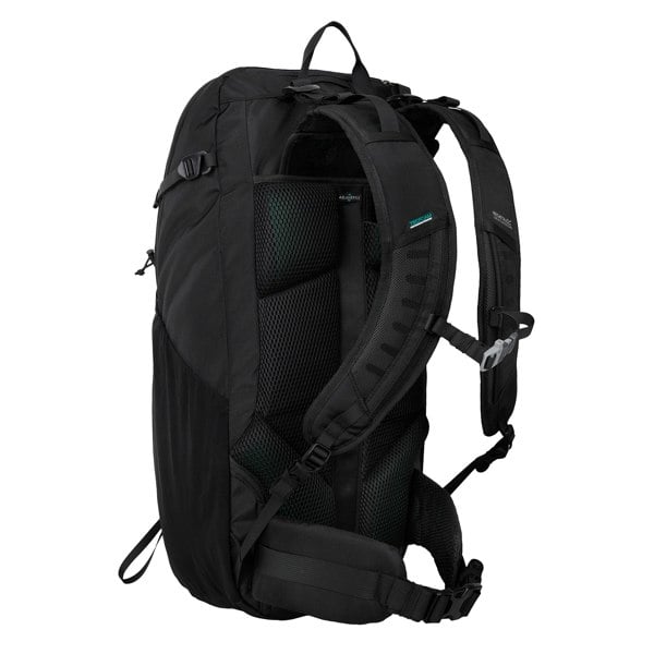 A single main compartment is paired with a zipped front pocket and two side pockets, helping you separate essentials for quick access. For a secure, adjustable fit, it features adjustable chest, hip and waist straps, along with padded adjustable shoulder straps and an ergonomic shoulder strap design. An air mesh back and Streamair ventilation system support breathability, while compression straps help stabilise your load. Finished in black with logo and text detailing, it also includes reflective detail and a safety whistle for added practicality.