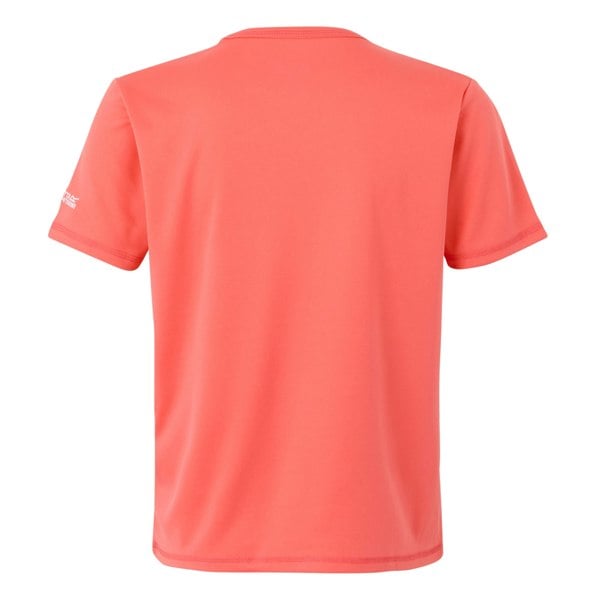 Regatta Childrens/Kids Alvarado IX Mountain T-Shirt in Peach Bloom is made from 100% recycled polyester in a piqué fabric with a 135gsm weight. It has a round neckline and short sleeves for a clean, simple shape.