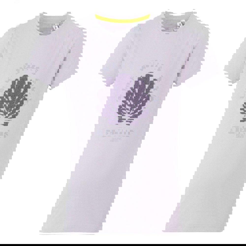 Regatta Childrens/Kids Bosley VIII Seashell T-Shirt in Lilac Thistle is made from 100% cotton in a single jersey fabric with a soft-touch finish. It has a rounded neckline and short sleeves for a classic T-shirt shape. The printed design combines a logo, seashell motif and text.