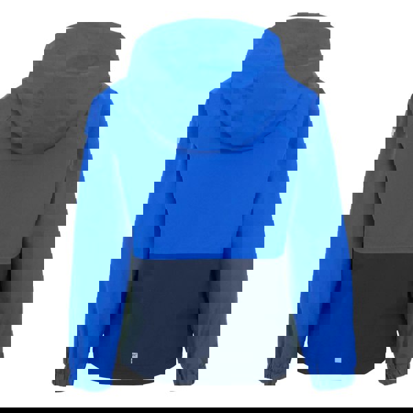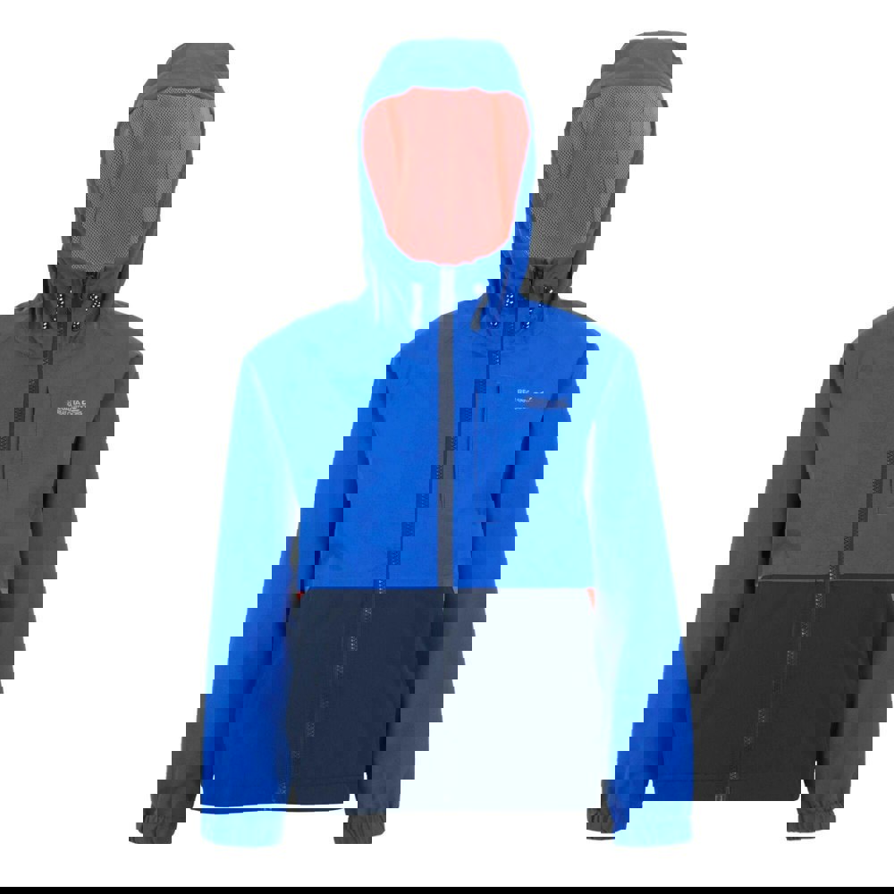 The Regatta Hanleigh II waterproof jacket comes in Olympian Blue, Navy and Tangerine Tango with a colour block design and logo detail. Made from 100% polyester with a peached fabric finish, it includes a mesh lining and taffeta-lined long sleeves. The hooded neckline has a grown-on hood with a drawstring for adjustment.