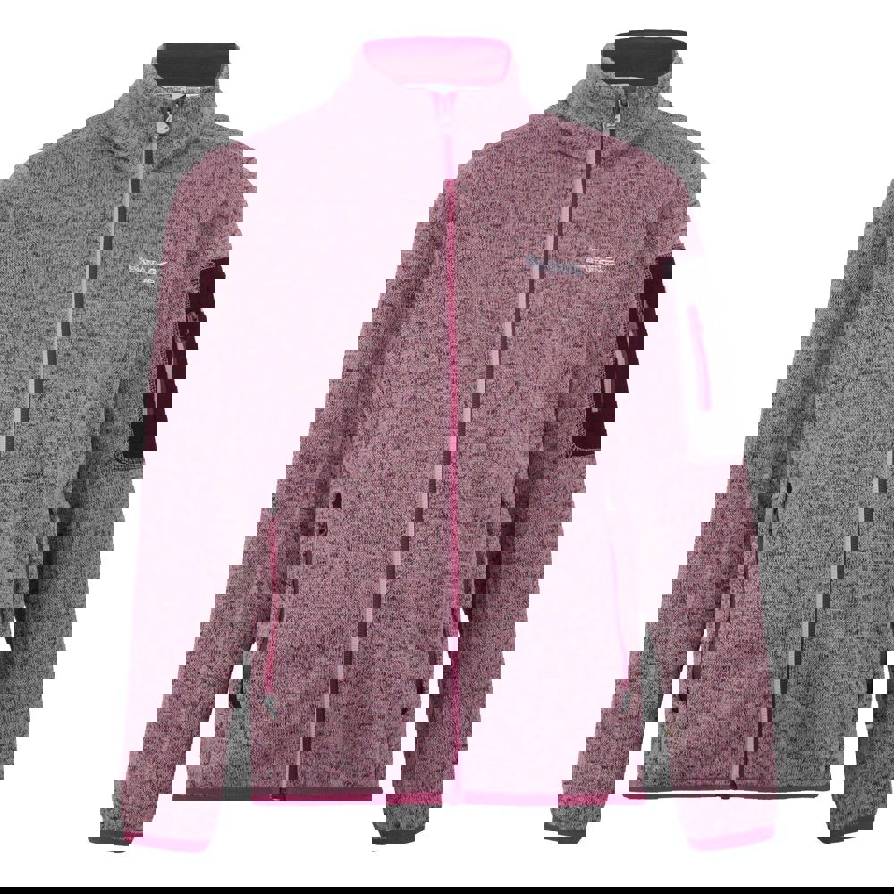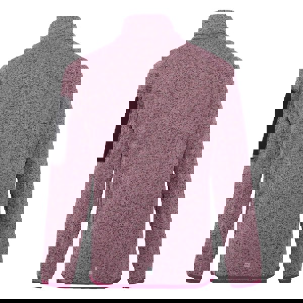 Regatta Newhill fleece jacket in Lilas/Beaujolais with a knit-effect marl finish and contrast detailing. Made from 100% polyester with stretch for a comfort fit, it has a standing collar and long sleeves finished with stretch binding at the cuffs and hem. Reflective trim and a logo detail complete the look.