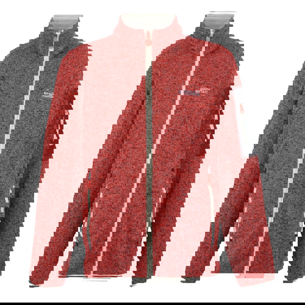 Regatta Childrens/Kids Newhill fleece jacket in Peach Bloom/Light Vanilla. Made from 100% polyester, this 250gsm layer has a knit-effect marl finish with stretch for a comfort fit. Contrast detailing and a logo add a clean, sporty look, while reflective trim provides added visibility.