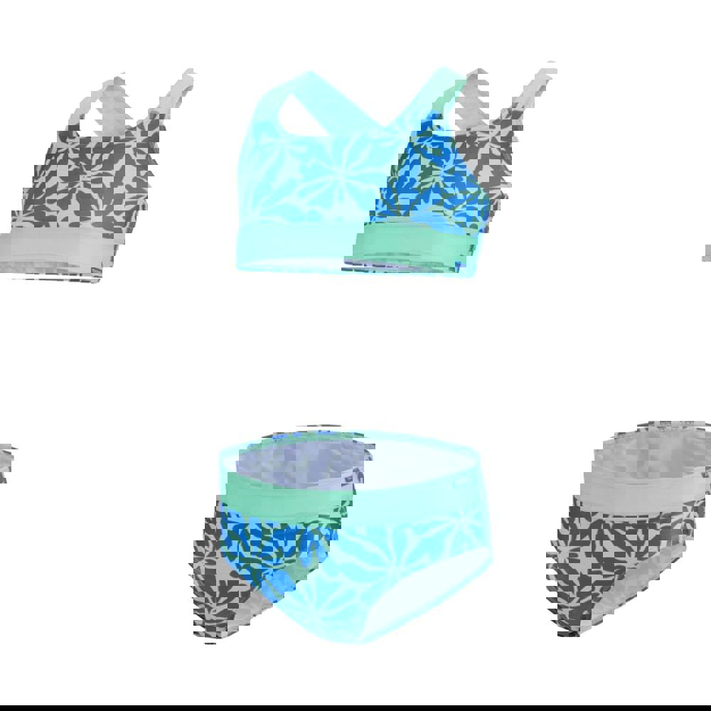 This two-piece bikini set comes in Sonic Blue and Ice Green with a floral and logo design. Made from a stretch fabric blend of 85% recycled polyester and 15% elastane, it includes one bikini top and one pair of bikini bottoms. The top has a square neckline and a cross-back style, with a pull-on fastening. The bottoms have an elasticated waistline. A branded tab completes the look.