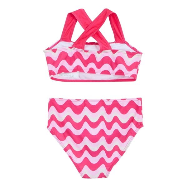 This bikini set includes a matching bikini top and bikini bottoms in a wavy striped design with logo detailing. The fabric combines 85% recycled polyester with 15% elastane, with a stretch, textured towelling finish. The top has a square neckline and a cross-back style, with a pull-on fastening.