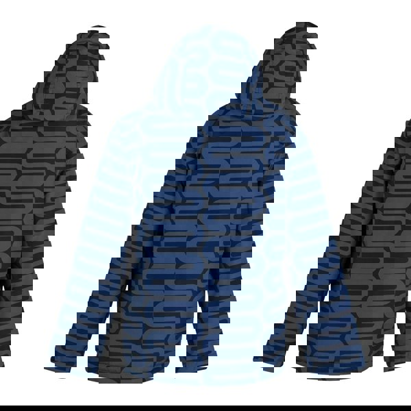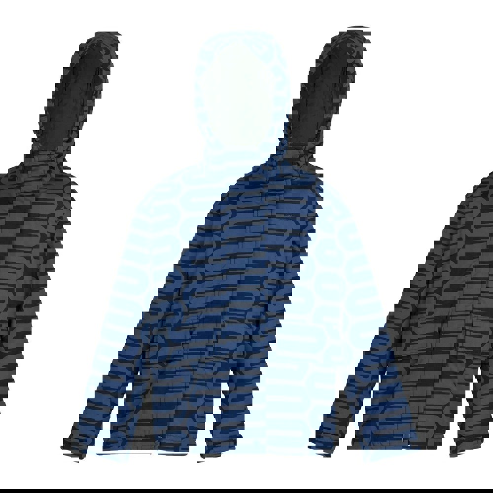 This Regatta girls Orla Kiely waterproof jacket in blue is made from 100% polyester and uses recycled materials. It has an all-over printed, patterned finish, a grown-on hood and long sleeves. The lining is printed taffeta, with insulated Thermo-Guard filling at 120gsm and an outer weight of 110gsm.