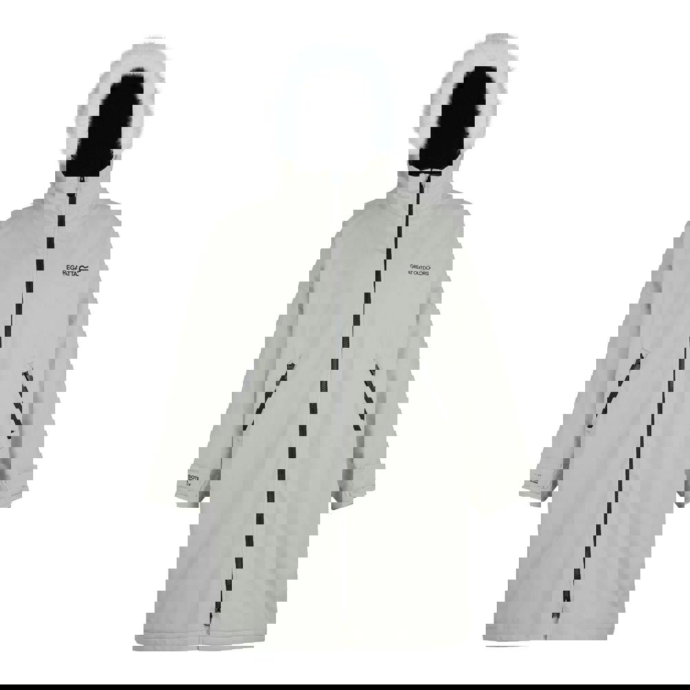 The long-sleeved design includes a grown-on hood with faux fur trim. Adjustable cuffs use touch fastening tabs for a secure fit. A full zip fastening runs through the front, with two zipped front pockets for small essentials. Breathability is rated at 20000g/m²/24hrs.