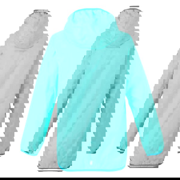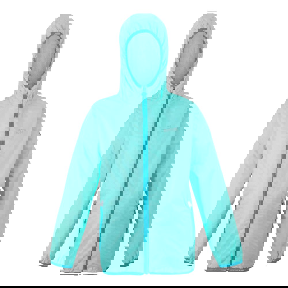 Regatta Great Outdoors Kids Lever II Packaway Rain Jacket in Aruba Blue/Exotic Plume. Made from 100% polyamide with a mesh fabric construction, this long-sleeved jacket has a two tone design and a grown on hood. A full zip fastening and zip neck provide a secure closure, while elasticated cuffs and a shockcord hem help adjust the fit. Two zip pockets offer practical storage, and reflective detail and a logo complete the look.
