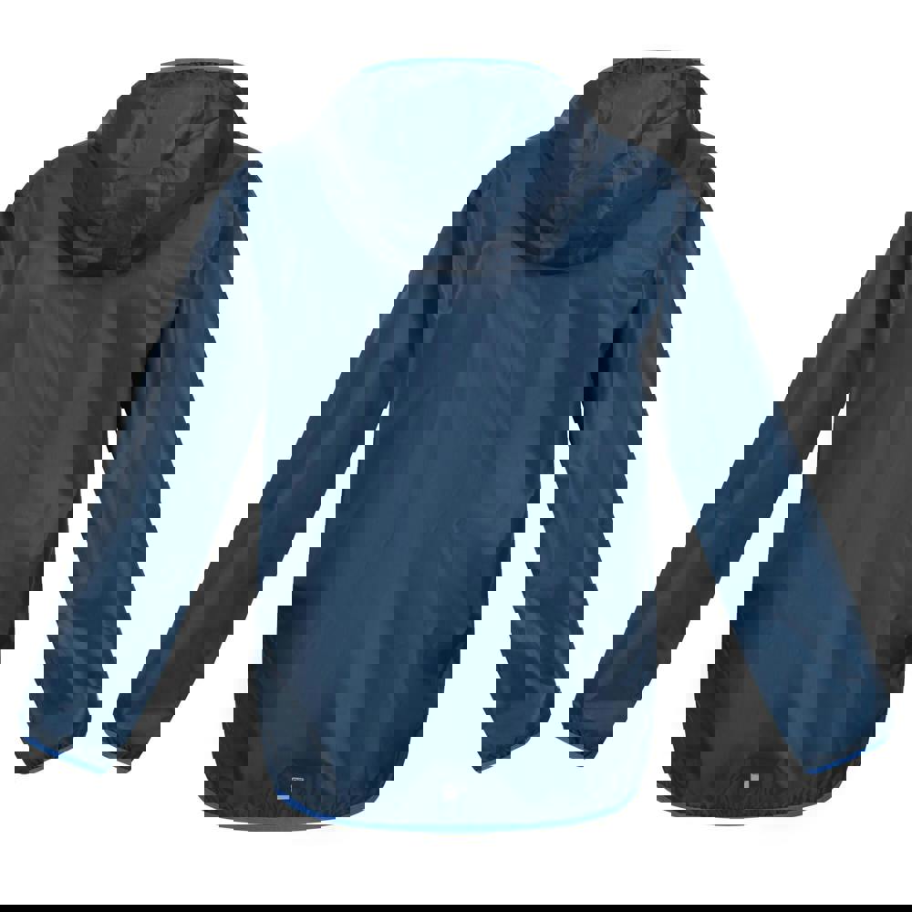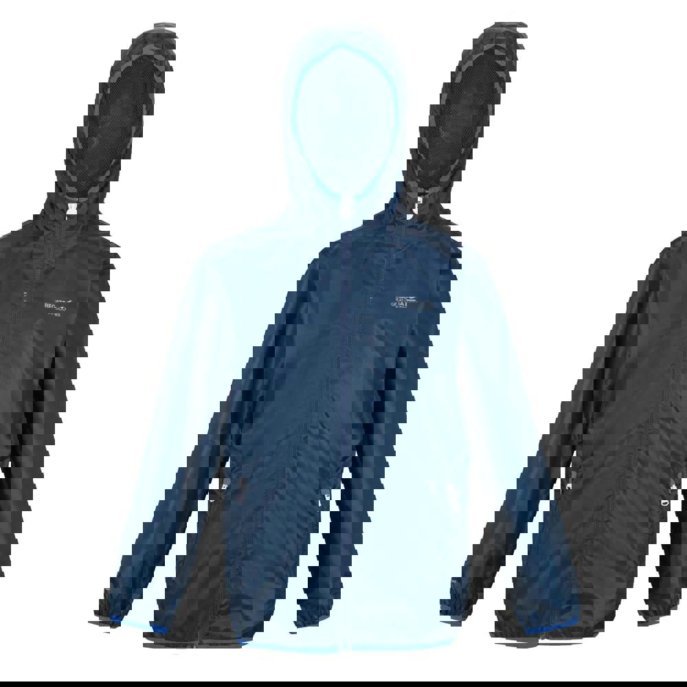 Regatta Great Outdoors Kids Lever II Packaway Rain Jacket in Moonlight Denim with a two tone mesh fabric construction in 100% polyamide. This long-sleeved jacket has a full zip fastening with a zip neck and a grown on hood. Elasticated cuffs and stretch binding provide a secure finish, while the shockcord hem allows adjustment.