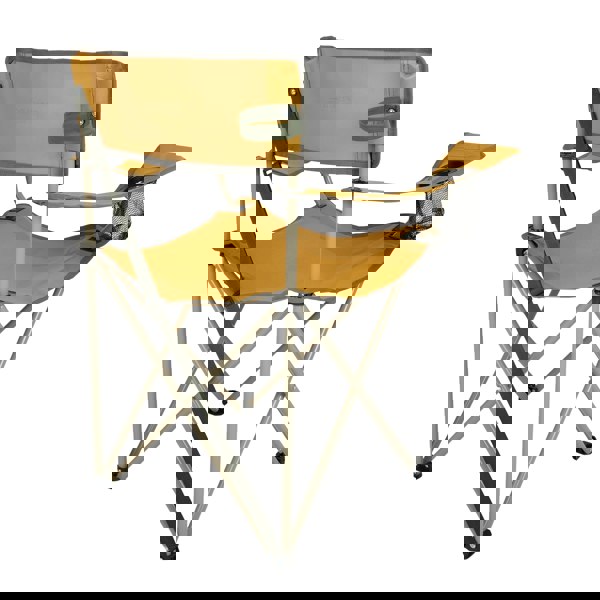 Finished in mustard with a logo design, it includes thoughtful details for everyday convenience. A built-in drinks holder keeps refreshments close to hand, while the shoulder strap helps with carrying. Storage and support straps complete the design, helping keep the chair secure when not in use.