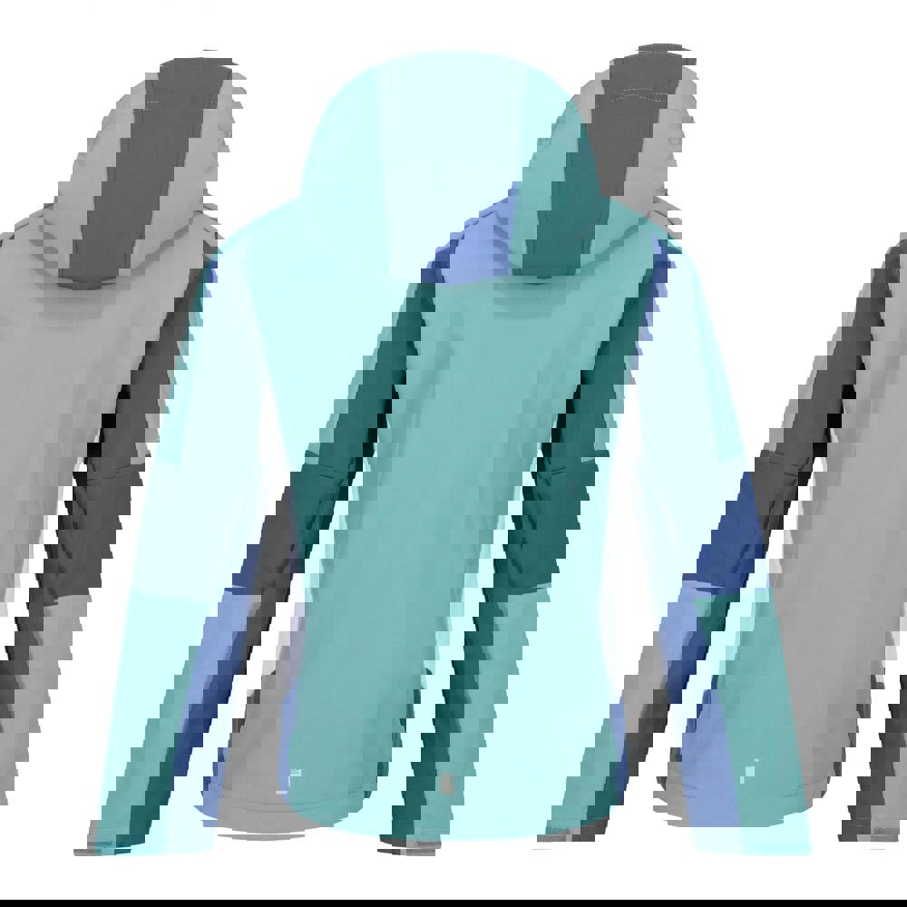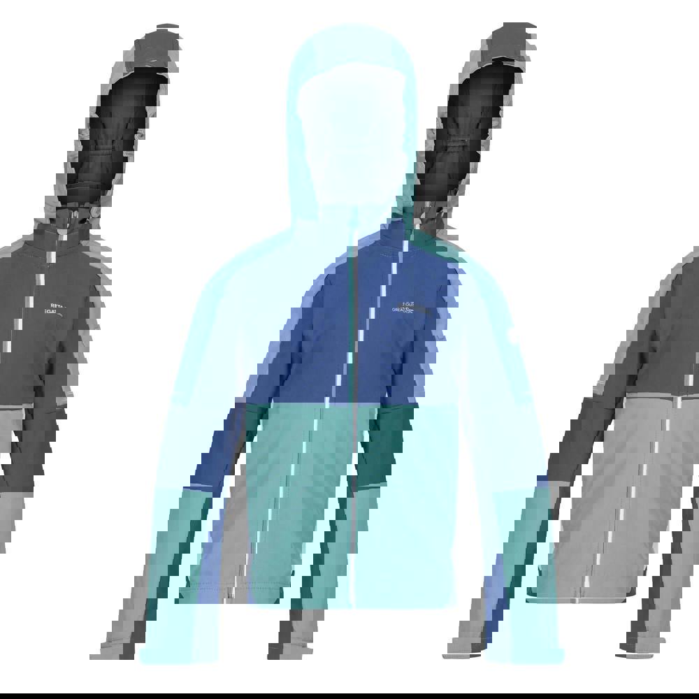 Regatta Kids Acidity VI lightweight soft shell jacket in Bristol Blue/Dusty Denim. Made from 96% polyester and 4% elastane, with jersey, softshell and stretch fabrics. Breathable fabric technology includes a DWR finish, with water-repellent and wind-resistant properties in a lightweight construction. A hooded neckline combines an elasticated edge with a zip-off design.
