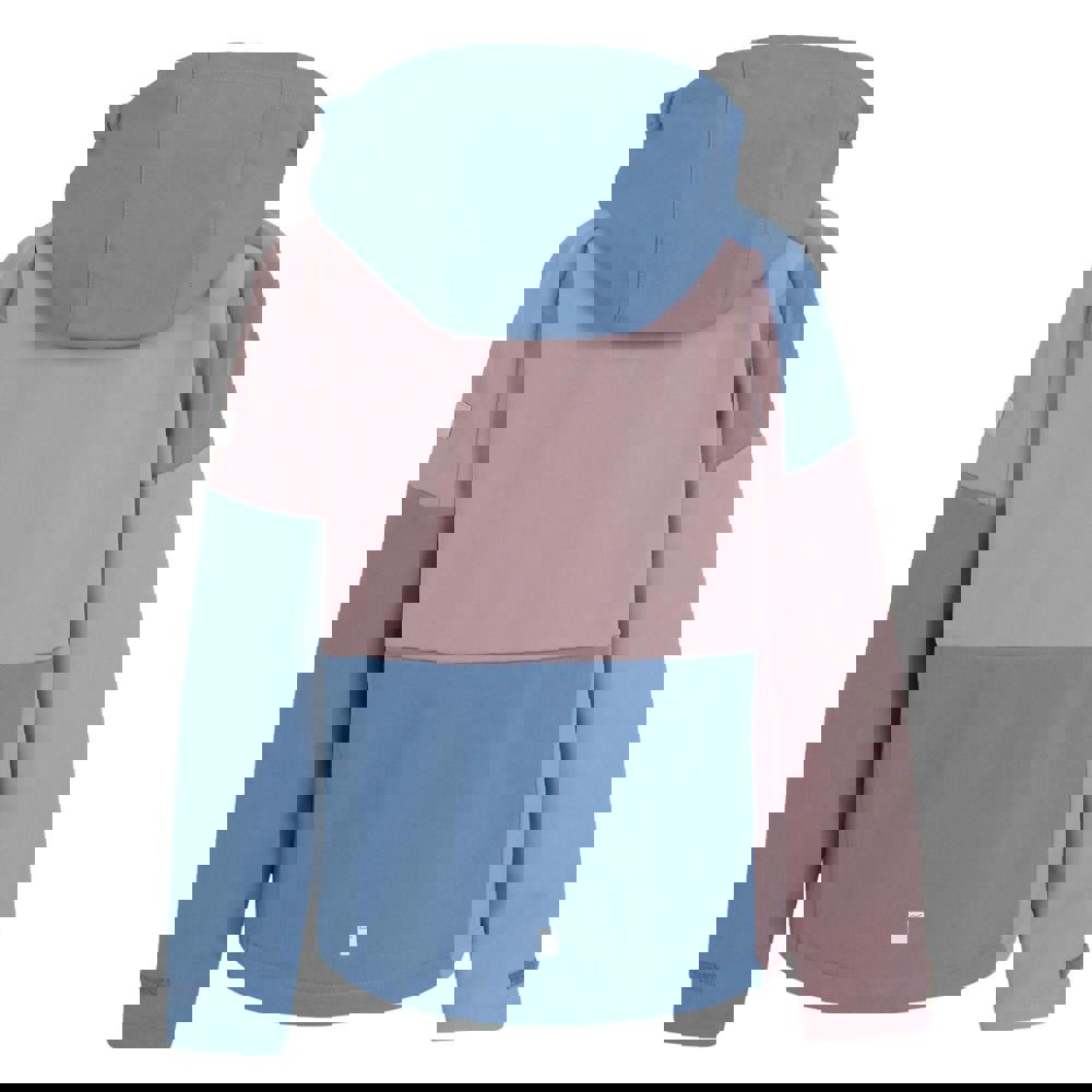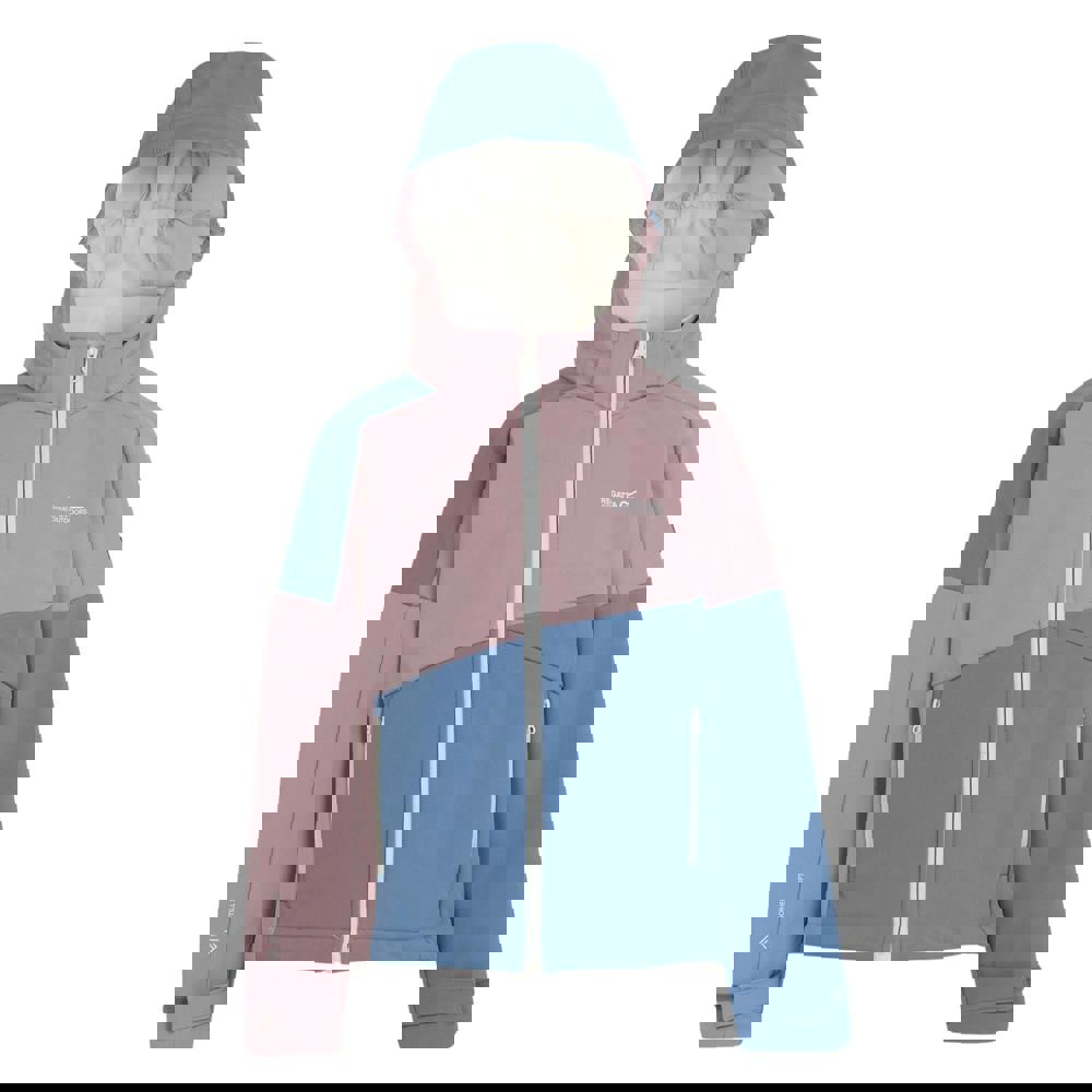 Regatta Kids Acidity VII Soft Shell Jacket in heather and coronet blue. Made from softshell stretch woven fabric with a plain finish and logo detail. The jacket includes a hooded neckline with a standing collar, plus a zip-off hood with an elasticated edge. Long sleeves and adjustable cuffs provide a secure fit, while a full zip fastening keeps the front clean and practical.