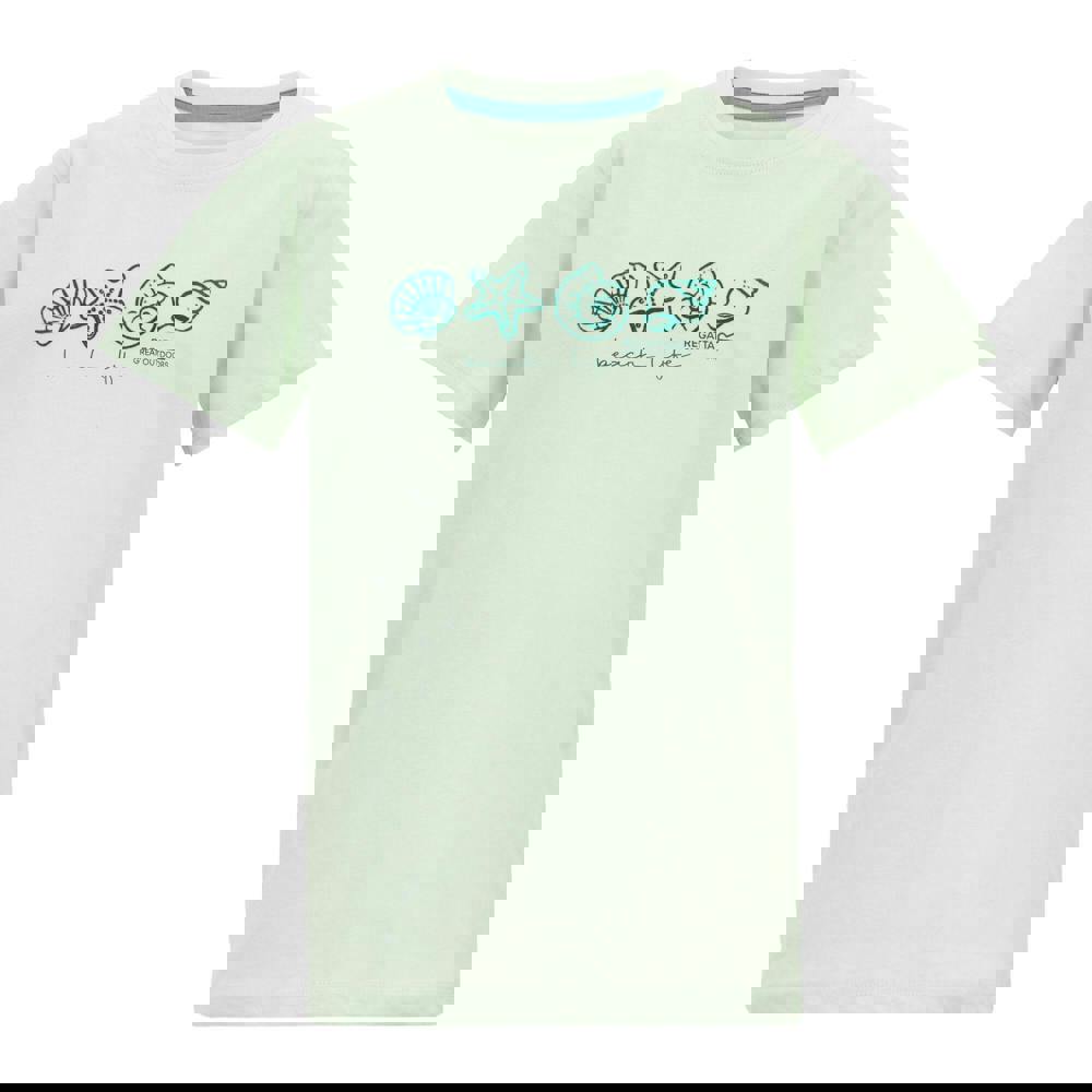 The Regatta Kids Bosley T-Shirt in Ocean Mist is made from 100% cotton in single jersey fabric. It has a crew neck with a ribbed finish and short sleeves. The design combines an embroidered logo with printed detailing. Fabric weight is 160gsm.