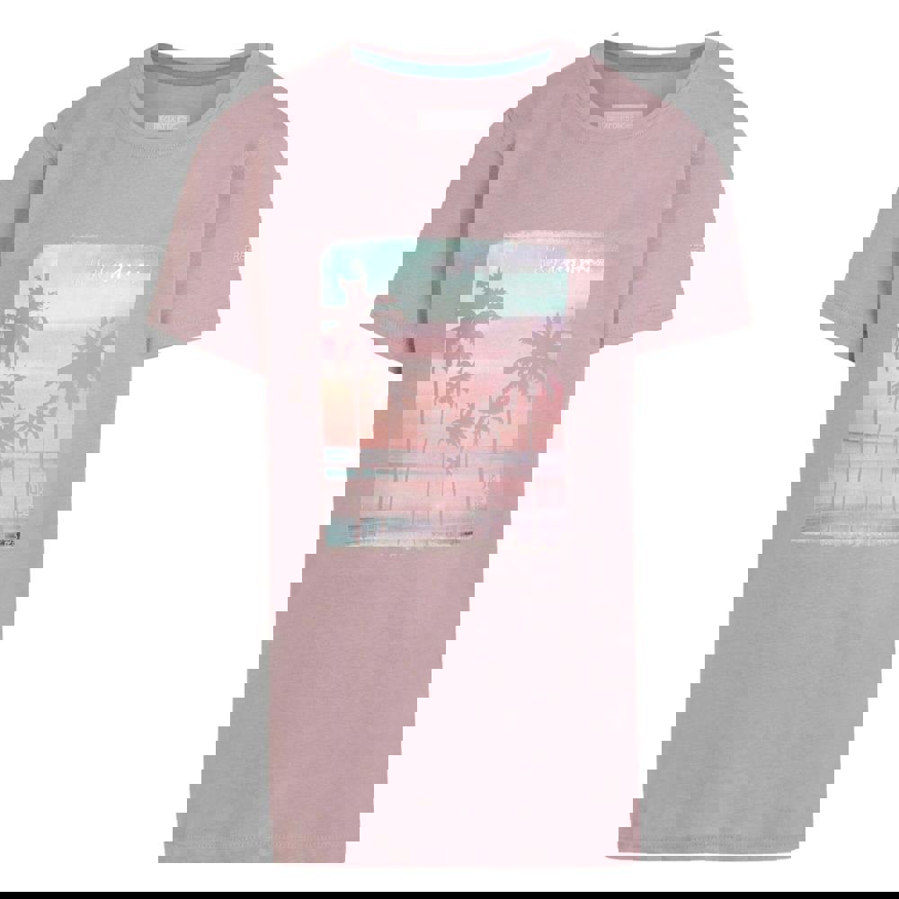 The Regatta Kids Bosley VII Happy Days Of Summer Beach T-Shirt comes in a heather finish with a beach-themed design. The print combines a logo, palm tree and text details for a clear seasonal look. Made from 100% cotton, it uses Coolweave jersey with a soft-touch handle and a 160gsm fabric weight.