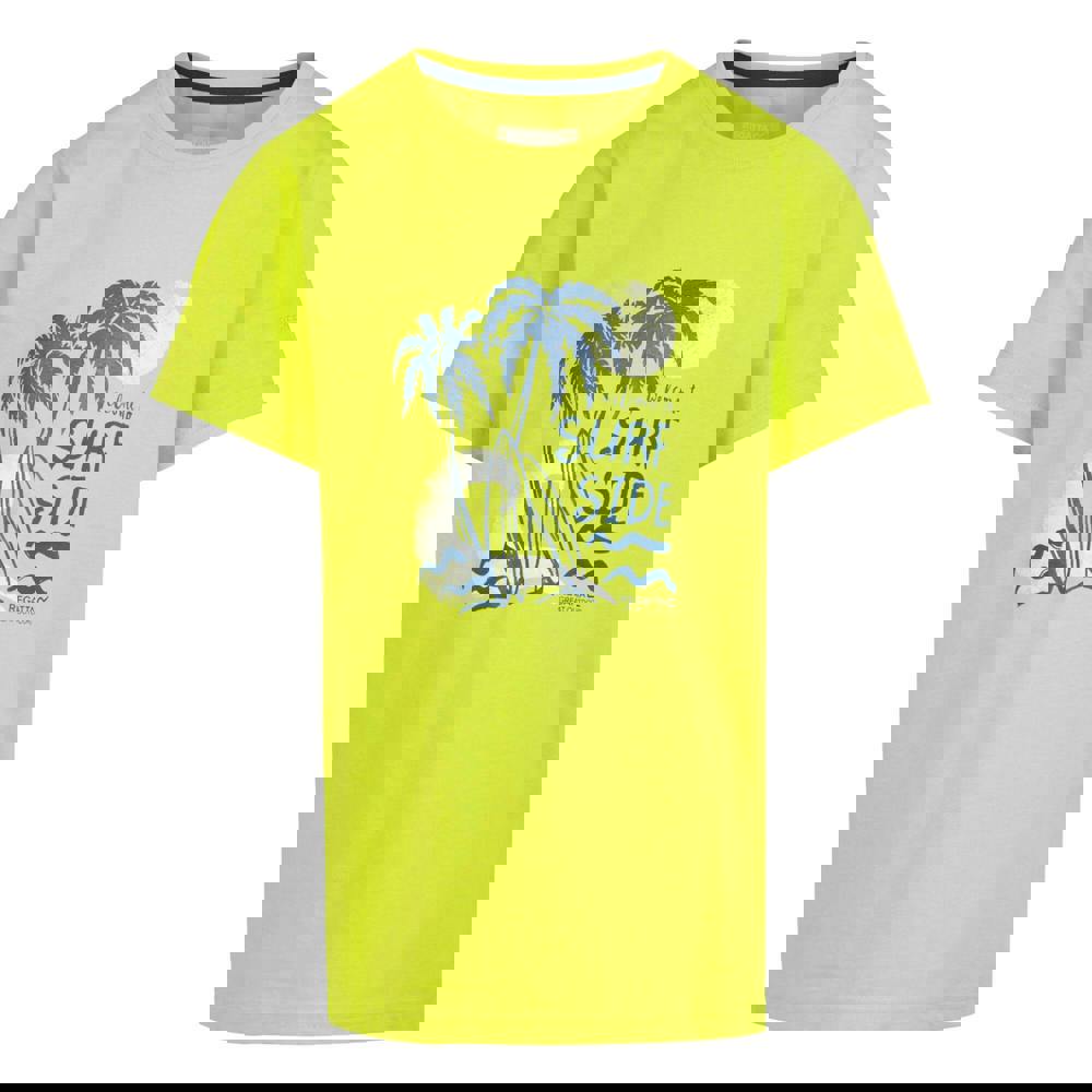 Regatta Kids Bosley VII Surfboard T-Shirt in citron lime is made from 100% cotton with a coolweave jersey construction and a soft-touch finish. The design combines a graphic print with logo and text details, alongside sun, surfboard and tree motifs. A crew neckline and short sleeves complete the classic T-shirt shape.