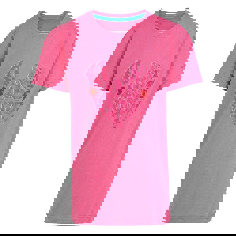 Regatta Kids Bosley VII Text T-Shirt in Flamingo Pink is made from 100% cotton with a Coolweave jersey construction and a soft-touch finish. The design combines a flower graphic print with text, set on a short-sleeved silhouette for a clean, casual look.