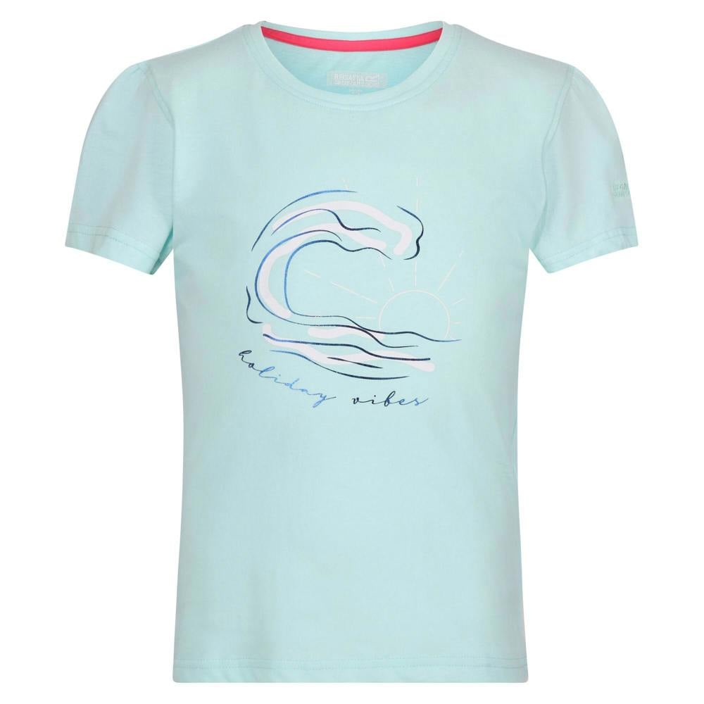 The Regatta Kids Bosley VII Wave T-Shirt comes in bleached aqua with a graphic print that combines a wave motif with logo and text details. Made from 100% cotton, it uses Coolweave jersey with a soft-touch finish and a 160gsm weight. A crew neckline and short sleeves keep the shape simple and easy to wear.
