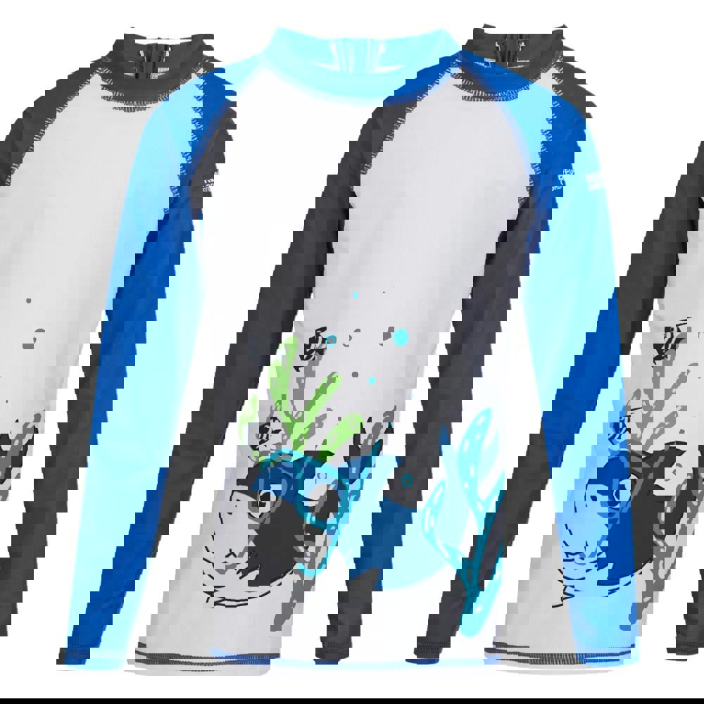 This kids’ rash suit from Regatta comes in Hawaiian blue with a bubbles and shark graphic print and logo. It includes two pieces: one top and one pair of shorts. The fabric has stretch and uses recycled materials, with a durable, quick-dry finish.