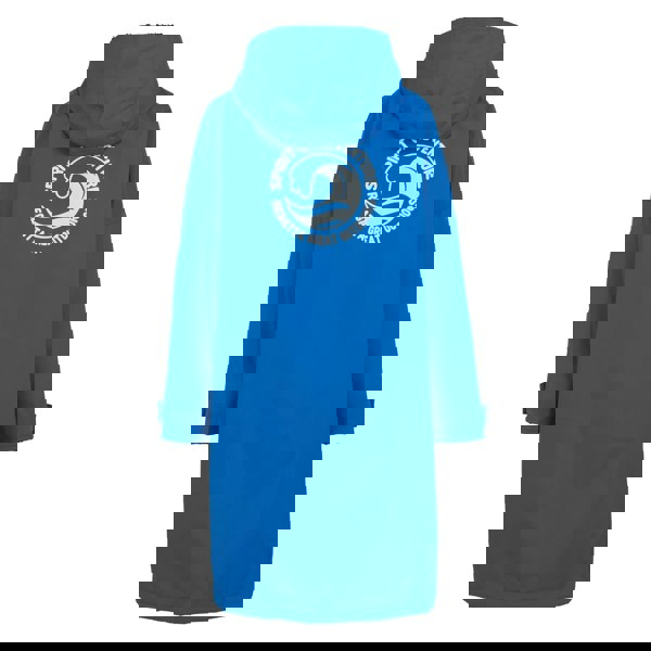 The design includes a back print with circle, logo and text details. An oversized fit allows extra room, while the grown-on hood and long sleeves add coverage. Adjustable wrist straps help secure the cuffs. Storage is provided by two lower zip pockets and one inner pocket, and the robe fastens with a full two-way zip. Made from recycled materials.