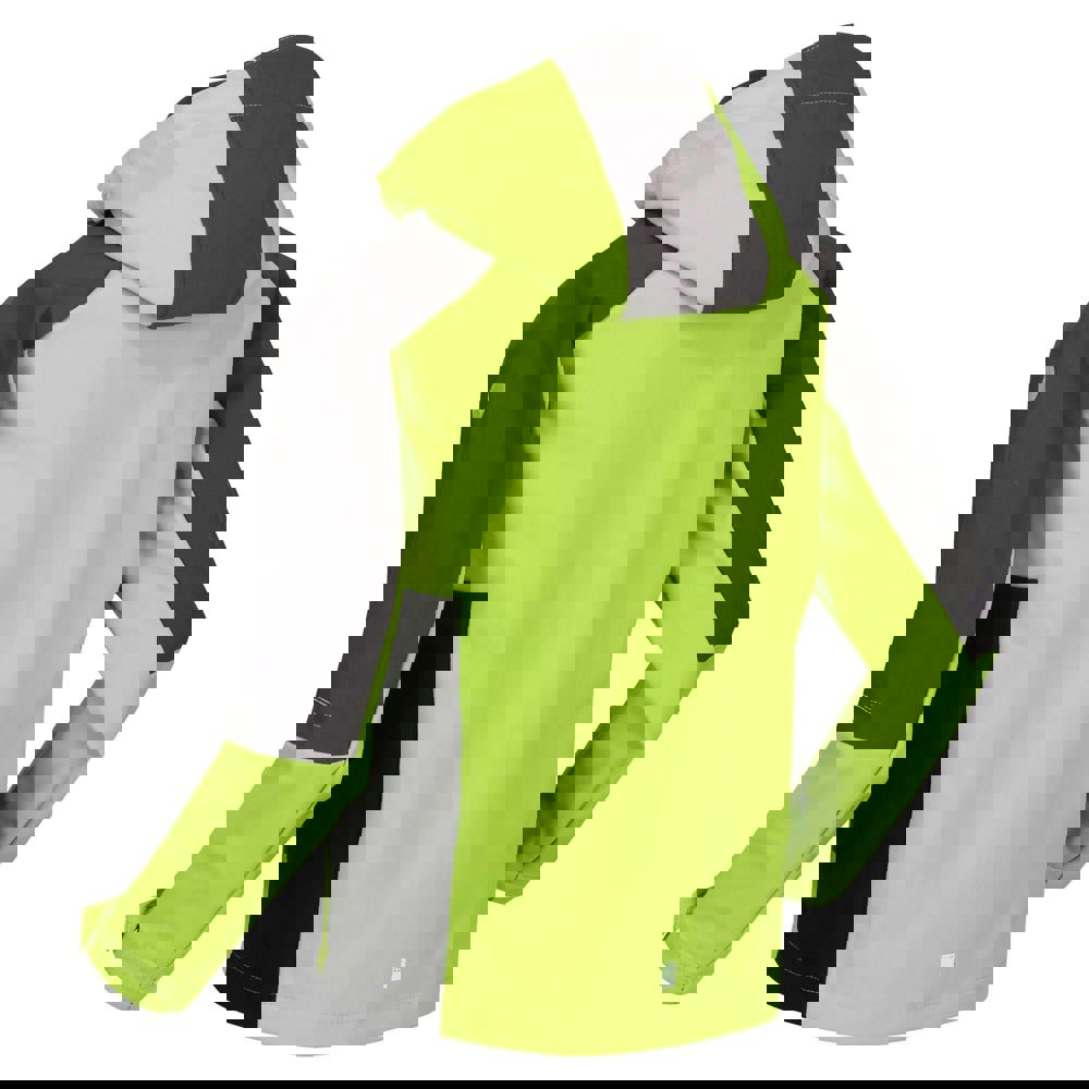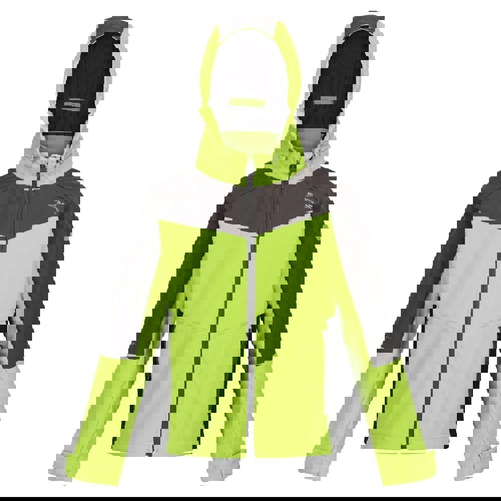 Regatta Kids Eastcott II soft shell jacket in bright kiwi and dark grey with a colour block design and logo. Made from stretch softshell with breathable, lightweight fabric technology. XPT construction with a DWR finish, plus waterproof and windproof performance.