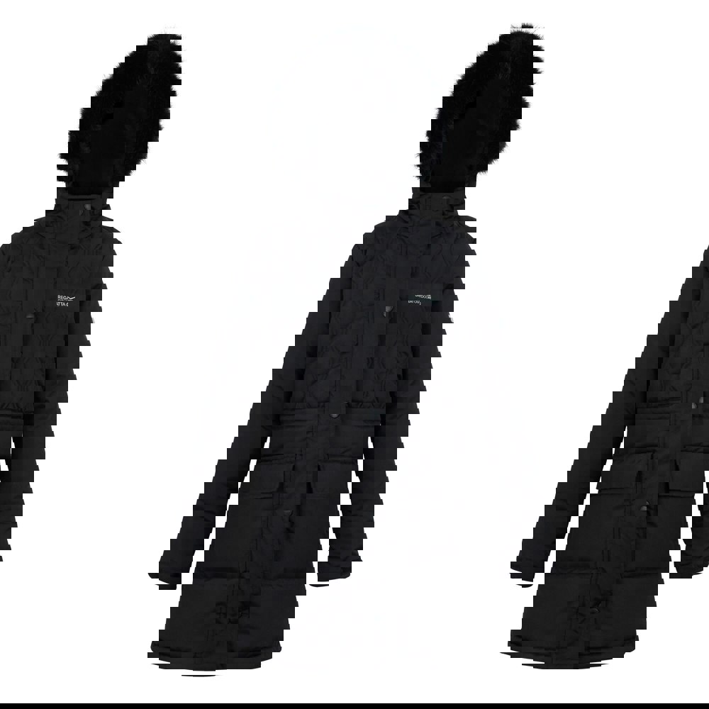 This kids’ Fabrizia II quilted jacket from Regatta comes in black with a logo design and reflective detailing. The outer is made from 100% polyester micro poplin, with a taffeta lining and 200gsm filling. An 84gsm outer weight is specified.