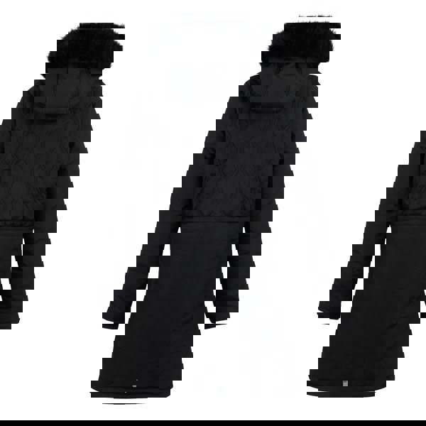 Durable, thermo-guard and water repellent fabric technology is stated. The jacket has a grown-on hood with faux fur trim, long sleeves and elasticated cuffs. A full zip fastening is paired with button fastening. Storage includes two side pockets with zip and flap closure. Made from recycled materials.