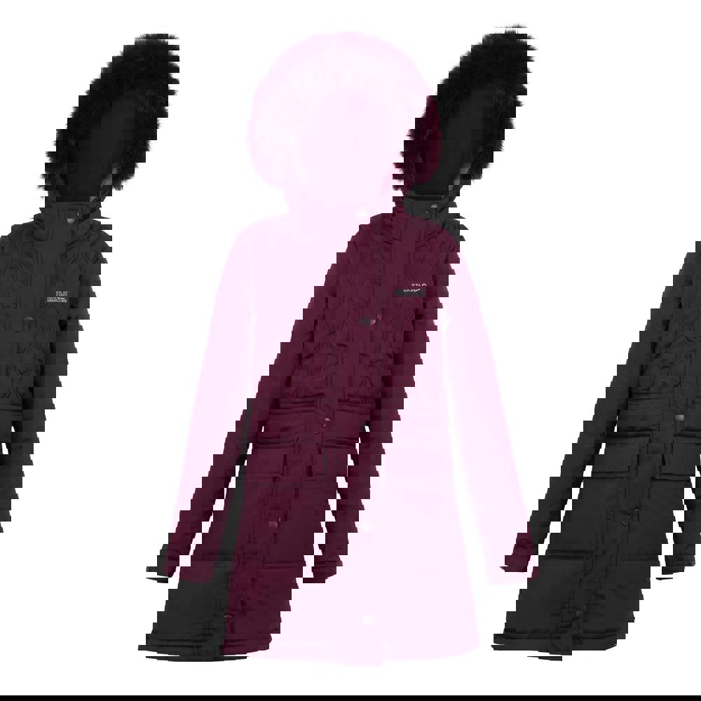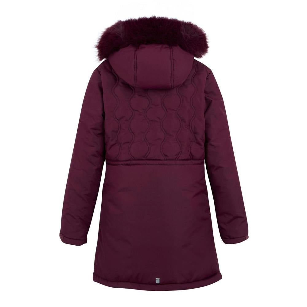The Regatta Kids Fabrizia II Quilted Jacket in fig uses micro poplin with a quilted finish and logo detailing. The outer is 100% polyester with a taffeta lining, plus a 200gsm filling and 84gsm outer weight. A grown-on hood with faux fur trim sits at the neckline, paired with long sleeves and elasticated cuffs.