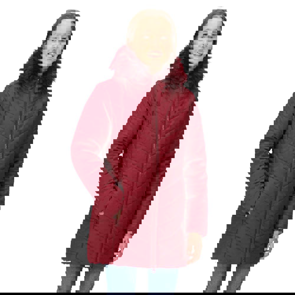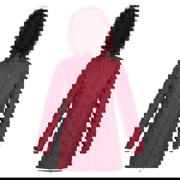 Built for colder days, the Regatta Kids Fabrizia insulated jacket comes in Dark Pimento with a micro poplin outer and a baffled finish. A hooded neckline and long sleeves create a practical, covered shape, while the grown-on hood is trimmed with faux fur. Two lower zip pockets keep small essentials secure, and a two-way zip fastening allows easy adjustment. Thermo-Guard insulation and a water-repellent finish complete the technical specification, alongside Regatta logo detailing.