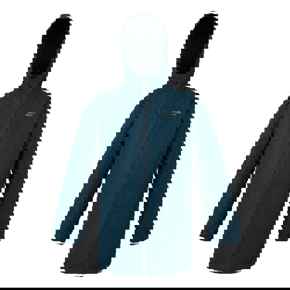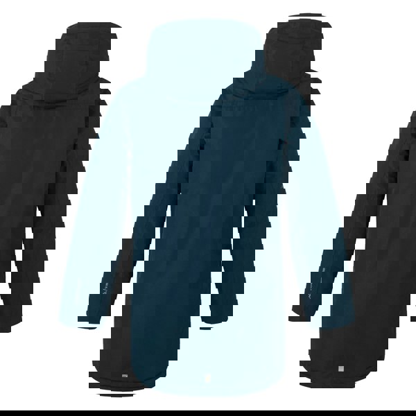 Regatta Kids Farbank II Waterproof Jacket in Moonlight Denim is made from 100% polyester and uses recycled materials. It has a plain finish with logo detailing, plus reflective trim and taped seams. The hooded neckline includes a grown-on hood with a sherpa lining, and the long sleeves are finished with adjustable cuffs and hook and loop straps.