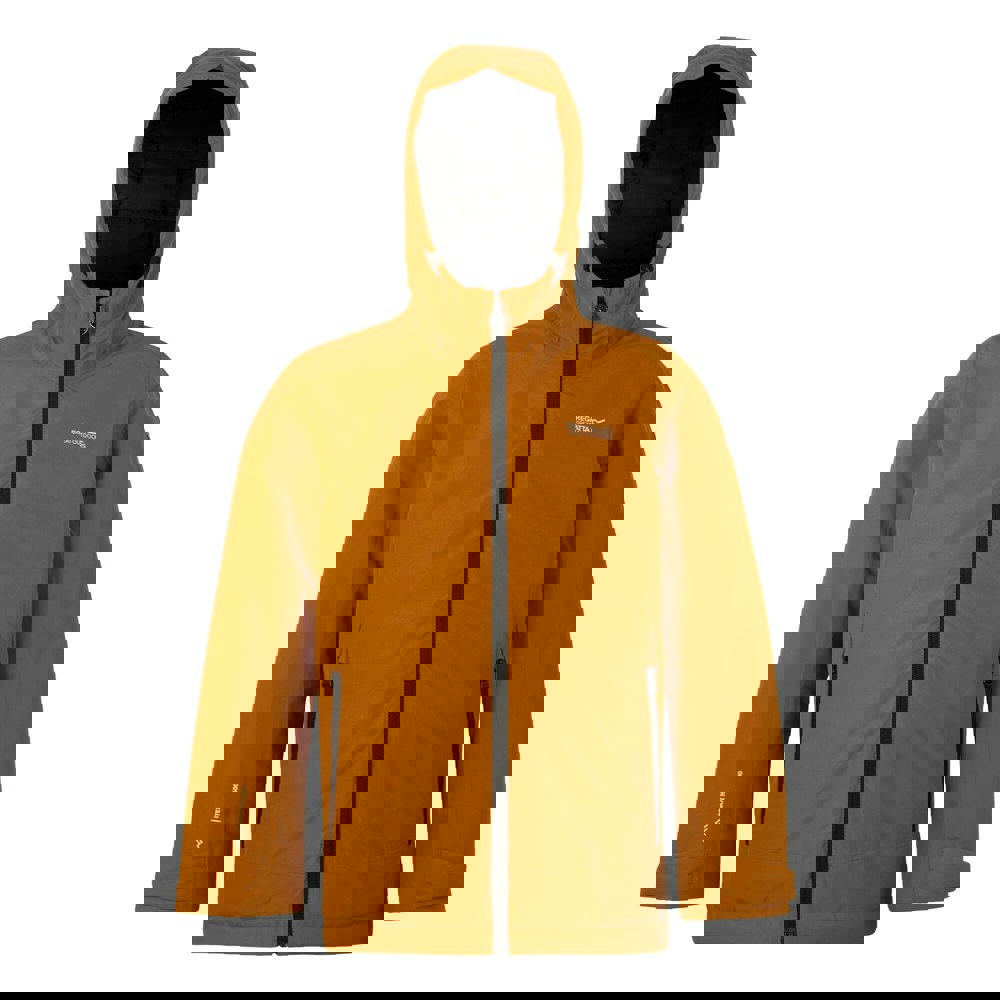 Regatta Kids Frelton Waterproof Jacket in Pumpkin Spice/Black, made from recycled materials. The outer is 100% polyester (110gsm) with a durable water repellent finish and Isotex 15000 fabric technology. Waterproof, windproof and breathable construction is supported by taped seams.