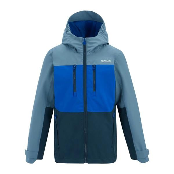 Built for wet and windy days, the Regatta Kids Highton Monochrome Waterproof Jacket combines a colour block look with technical protection. It uses an outer in 100% recycled polyester with a 100% polyester lining and mesh lining, finished in stretch taffeta. A hooded neckline and long sleeves provide coverage, while adjustable cuffs and an adjustable shockcord hem allow the fit to be refined.