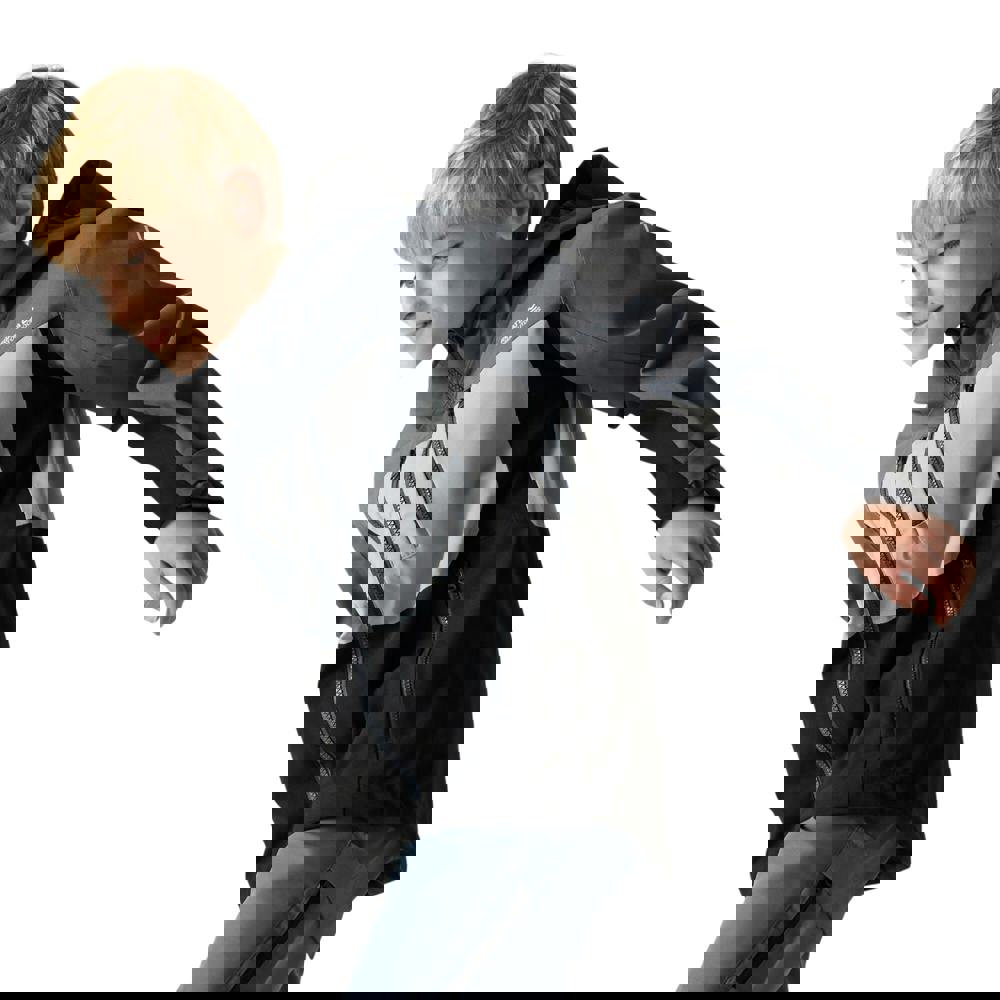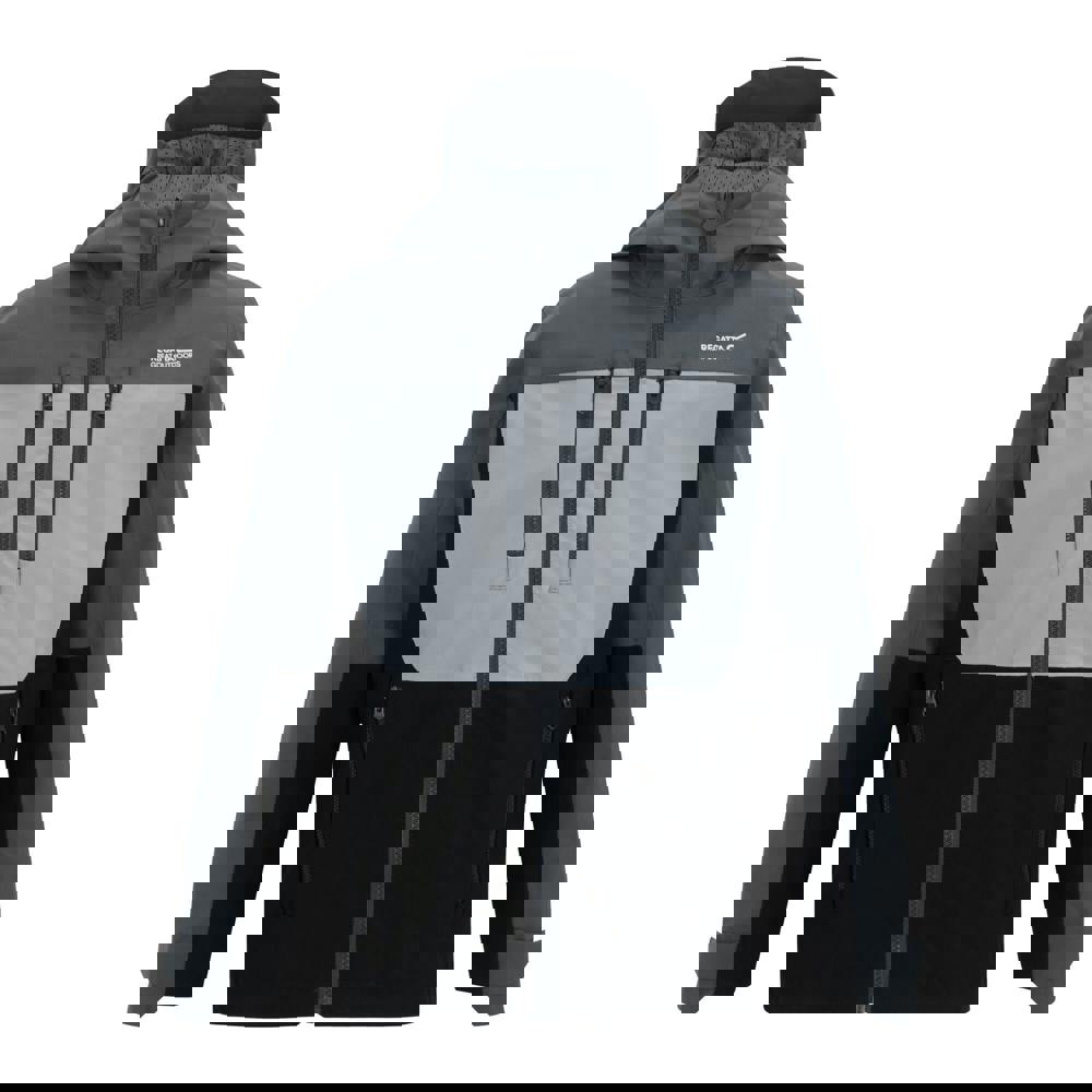 This kids’ waterproof jacket is made with a 100% recycled polyester outer and a 100% polyester lining with mesh. The stretch taffeta fabric has a colour block design in seal grey, cloudy grey and black, with an 88gsm weight. Isotex 20000 fabric technology combines a durable water repellent finish with breathable, windproof and waterproof performance, supported by taped seams and a 20000g/m²/24hrs breathability rating.