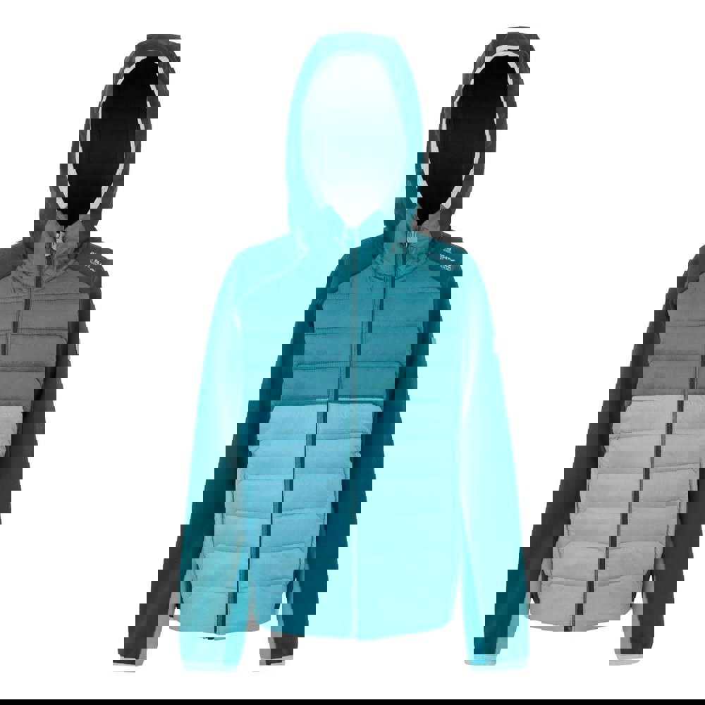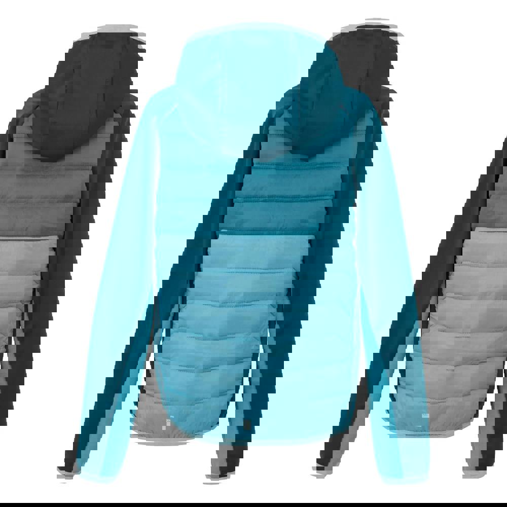 The Regatta Kids Kielder IX Hybrid Jacket comes in Moroccan Blue, Storm Blue and Nordic Blue, with a quilted finish and logo detailing. Made from elastane, polyamide and polyester, it uses Extol Stretch fabric for unrestricted movement. A hooded neckline with a standing collar adds coverage, while long sleeves are finished with stretch binding at the cuffs.