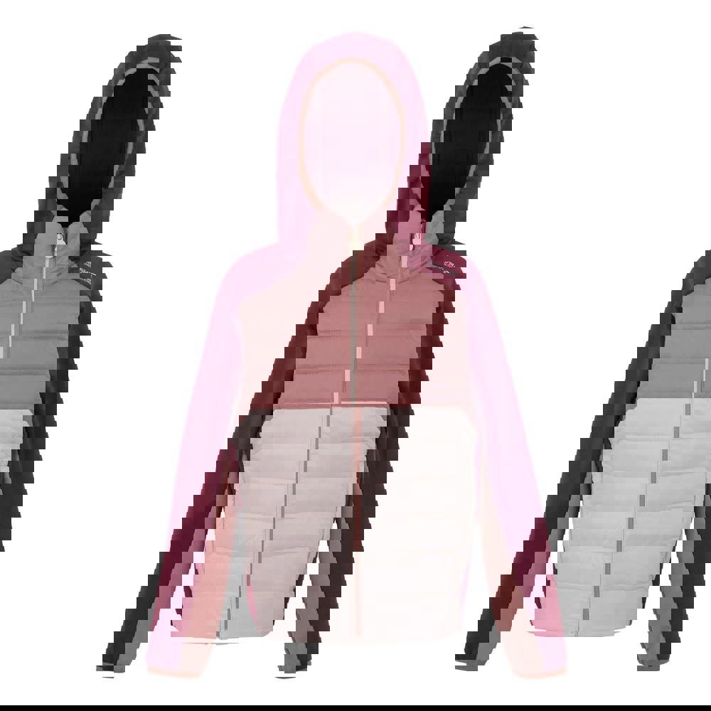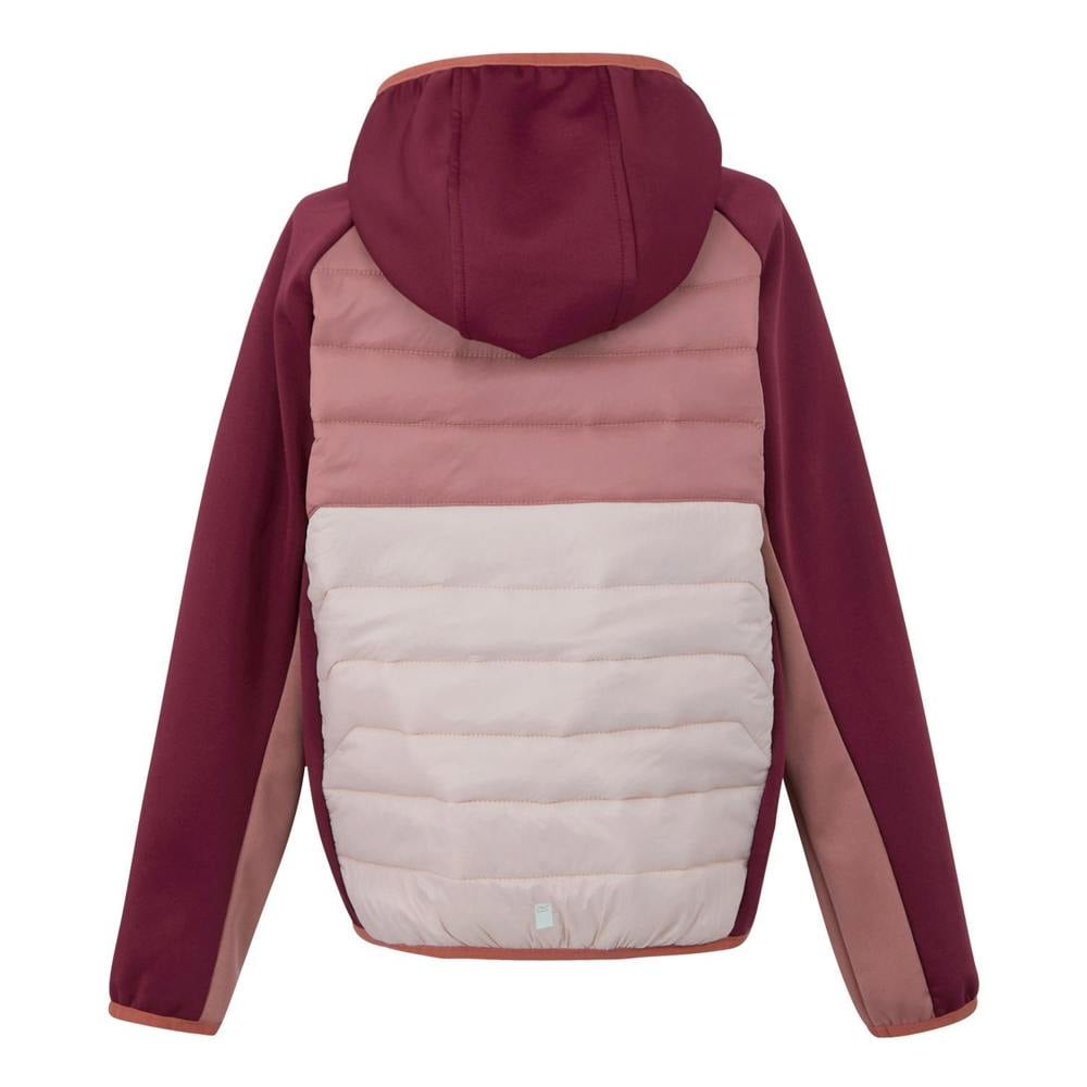 The Regatta Kids Kielder IX Hybrid Jacket comes in pink with a quilted finish and logo detailing. It uses Extol Stretch fabric with a durable water repellent finish and a lightweight, insulating construction. The shell blends elastane, polyamide and polyester, with Down-Touch Warmloft filling at 60gsm and a 235gsm weight.