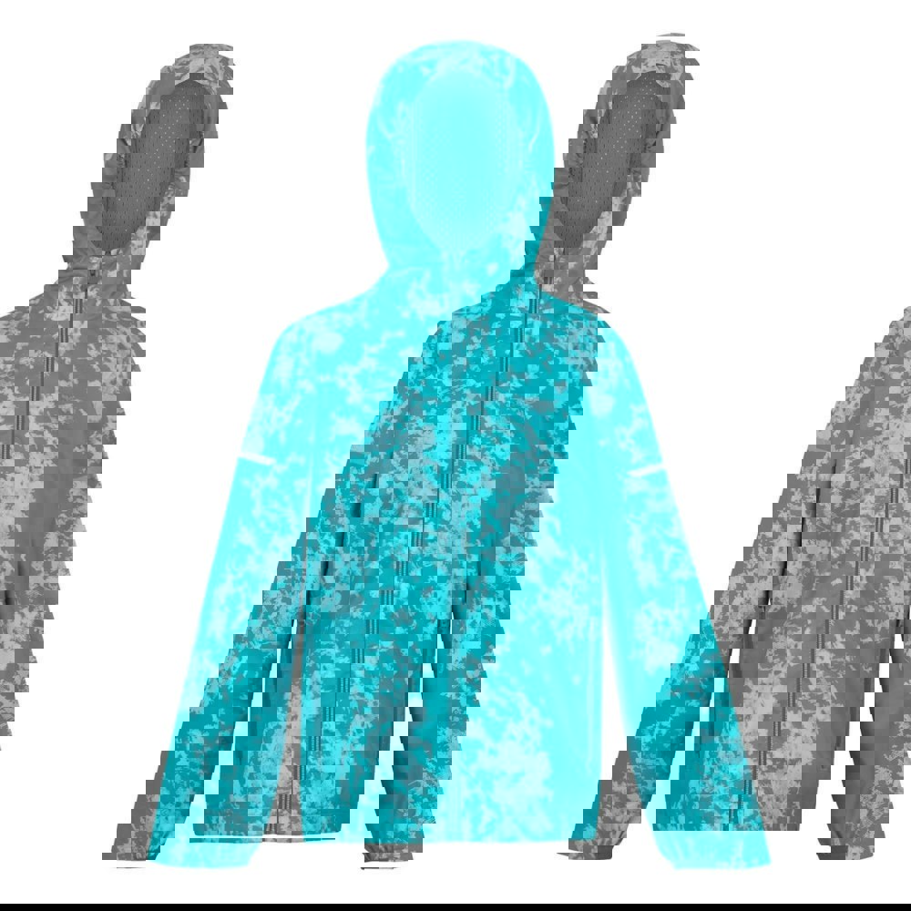 Regatta Kids Lever II Abstract Waterproof Jacket in Icy Morn/Aruba Blue/Exotic Plume is made from 100% polyester with a mesh lining and an 80gsm construction. The abstract all-over print is finished with reflective detail. A grown-on hood and long sleeves create a practical outer layer, while binded, elasticated cuffs give a secure edge at the wrists.