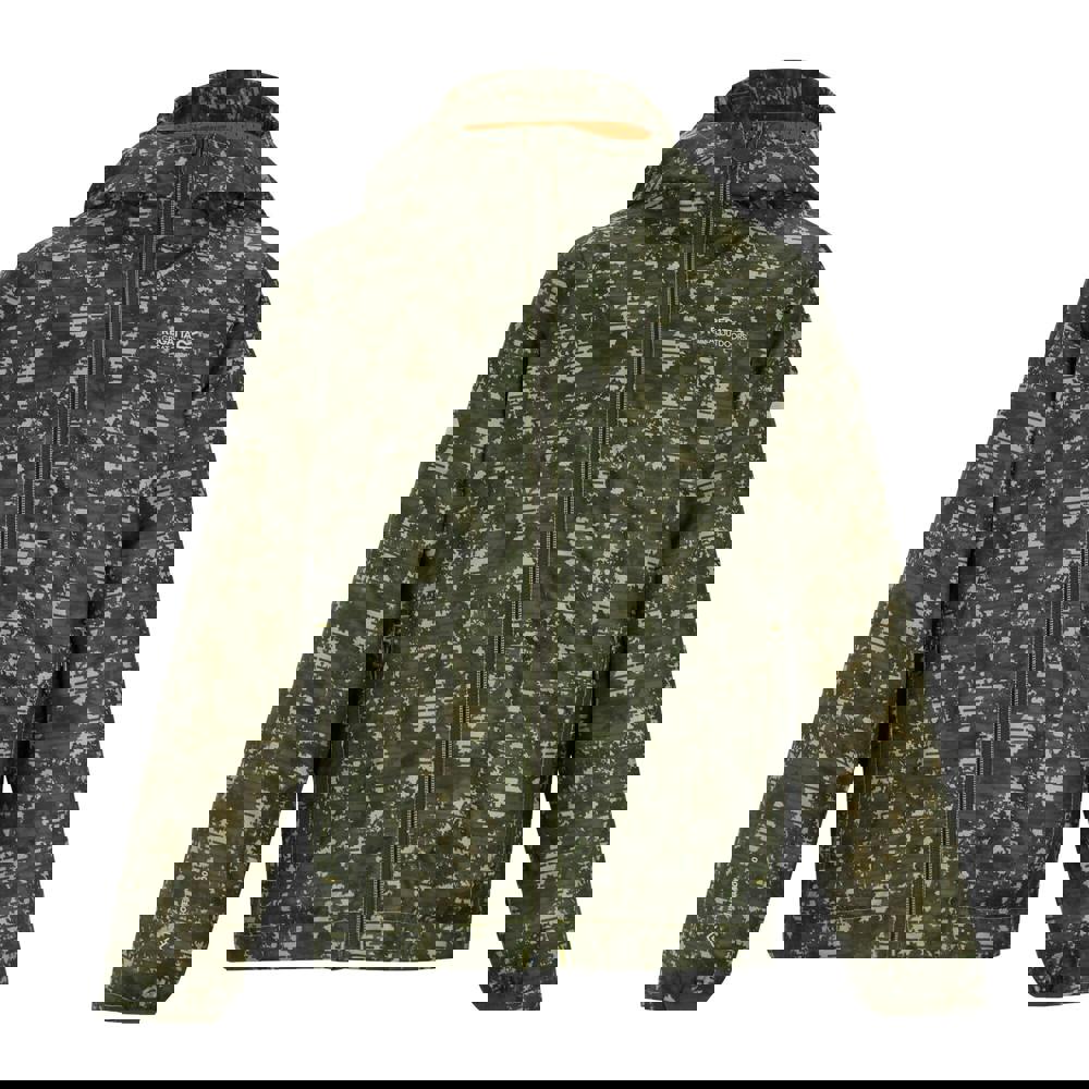 This kids’ waterproof jacket from Regatta comes in Light Sage with a line camo and logo design. It uses Isolite 10000 fabric technology with taped seams and a durable water repellent finish, alongside a breathable rating of 10000g/m²/24hrs. A mesh lining and lightweight 80gsm construction keep the inside simple and practical.