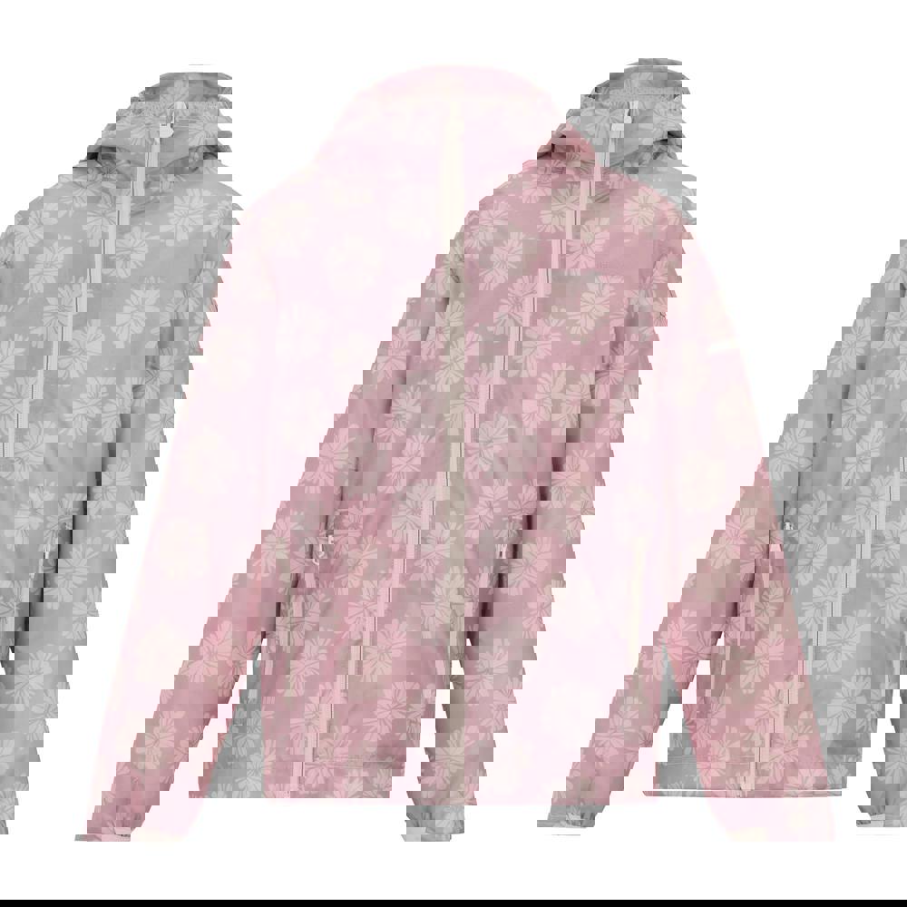 Regatta Kids Lever II Petal Waterproof Jacket in powder lilac and pink haze. This long-sleeved jacket has a hooded neckline with a grown-on hood and mesh lining, plus a mesh lining through the garment. A full zip fastening and two side zip pockets keep the finish practical and streamlined. The curved back hem and elasticated, binded cuffs complete the shape.
