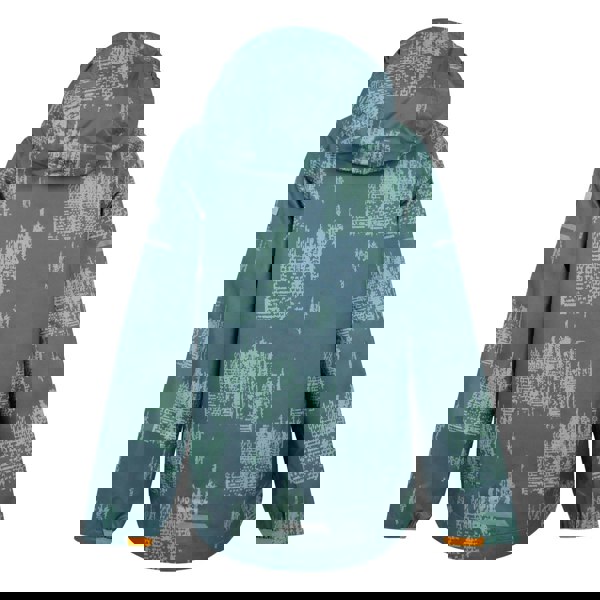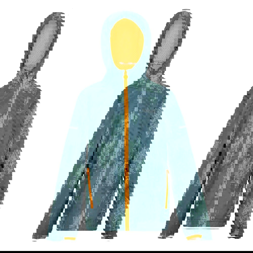 Regatta Kids Lever II Printed Waterproof Jacket in Stormy Weather/Glacier/Bright Marigold. Made from 100% polyester with a mesh lining, this lightweight jacket has a printed, patterned finish with logo detailing. A grown-on hood with mesh lining and long sleeves with stretch binding at the cuffs create a snug fit.