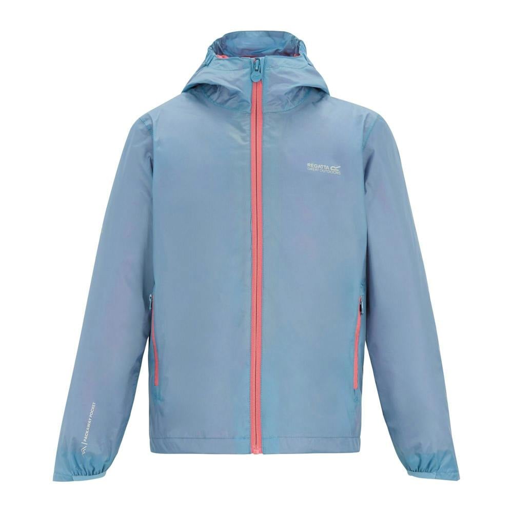 This kids’ Lever waterproof shell jacket from Regatta comes in washed denim and peach pink, with contrast detailing and a mountain and logo design. Made from 100% polyamide with a mesh lining, it uses lightweight fabric with a durable water repellent finish. The hooded neckline includes a grown-on hood with mesh lining, and the long sleeves and taped seams support weather protection.