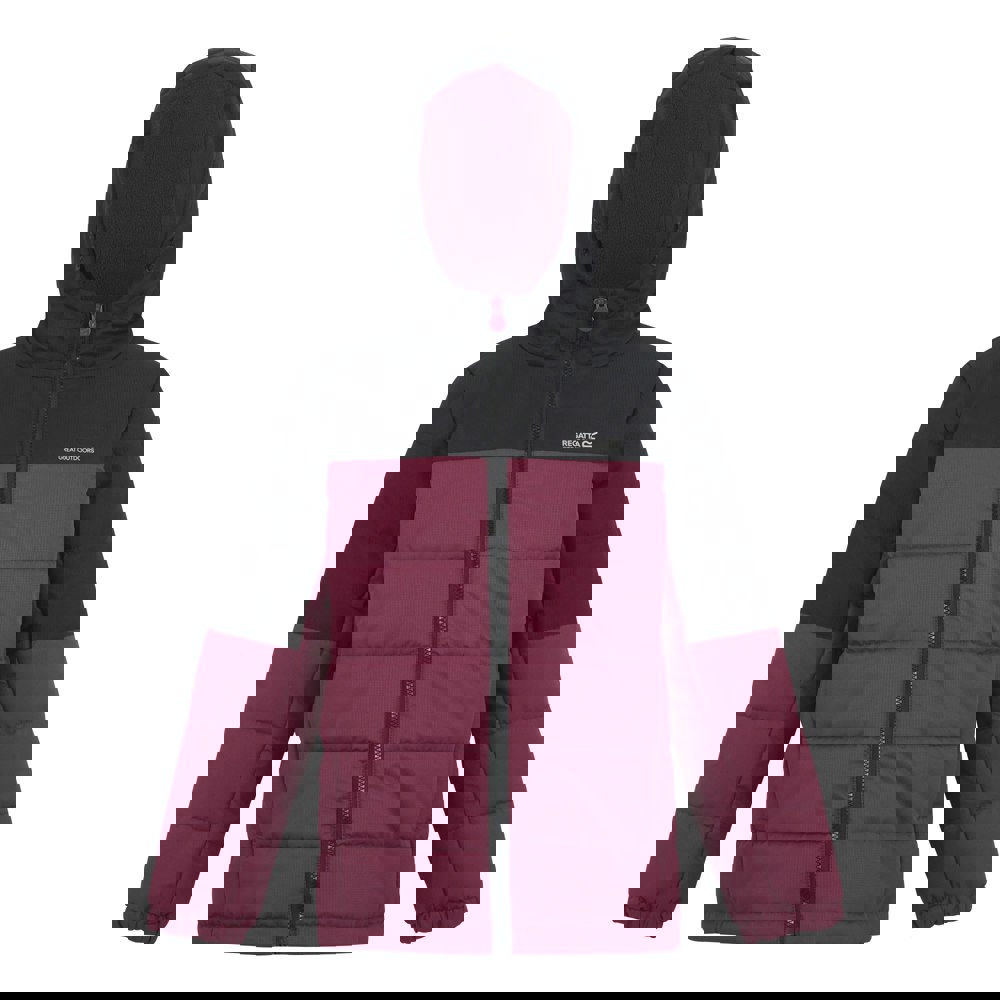 The Regatta Kids Lofthouse insulated jacket comes in Black/Dark Pimento with a colour block design and logo detailing. Made from 100% polyester, it uses synthetic down filling at 200gsm and a durable water repellent finish.