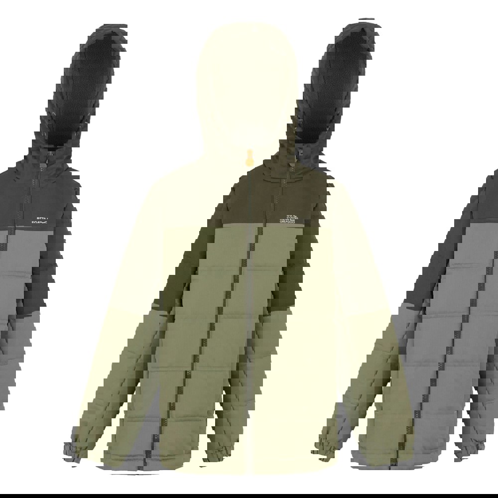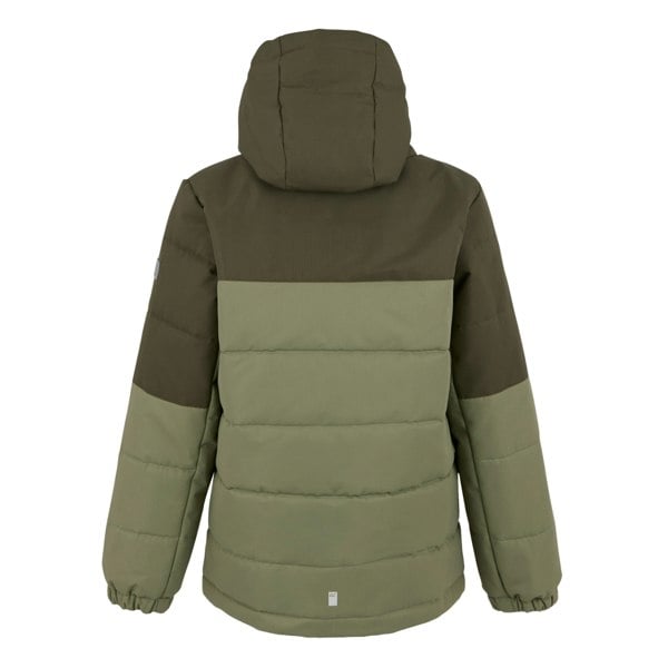 Regatta Kids Lofthouse insulated jacket in Olive Night/Oil Green/Pumpkin Spice with a colour block design and logo detailing. Made from 100% polyester and padded with synthetic down at 200gsm, it is finished with a durable water repellent treatment.